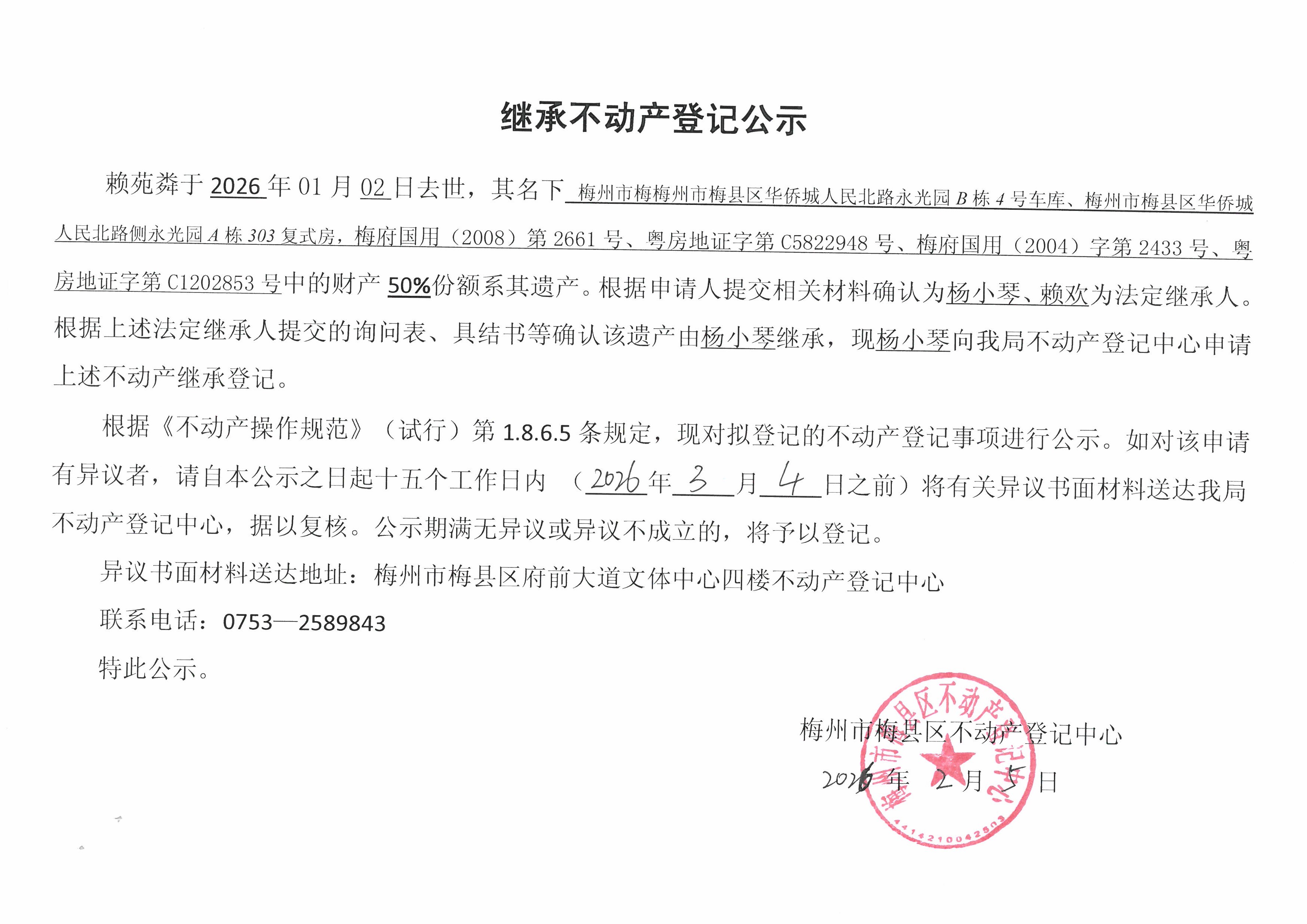 赖苑粦于2026年01月02日去世,其名下梅州市梅县区华侨城人民北路永光园B栋4号车库、梅州市梅县区华侨城人民北路侧永光园A栋303复式房,梅府国用(2008)第2661号、粤房地证字第C5822948号、梅府国用(2004)字第2433号、房地证字第C1202853号中的财产50%份额系其遗产。根据申请人提交相关材料确认为杨小琴、赖欢为法定继承人。根据上述法定继承人提交的询问表、具结书等确认该遗产由杨小琴继承,现杨小琴向我局不动产登记中心申请上述不动产继承登记。