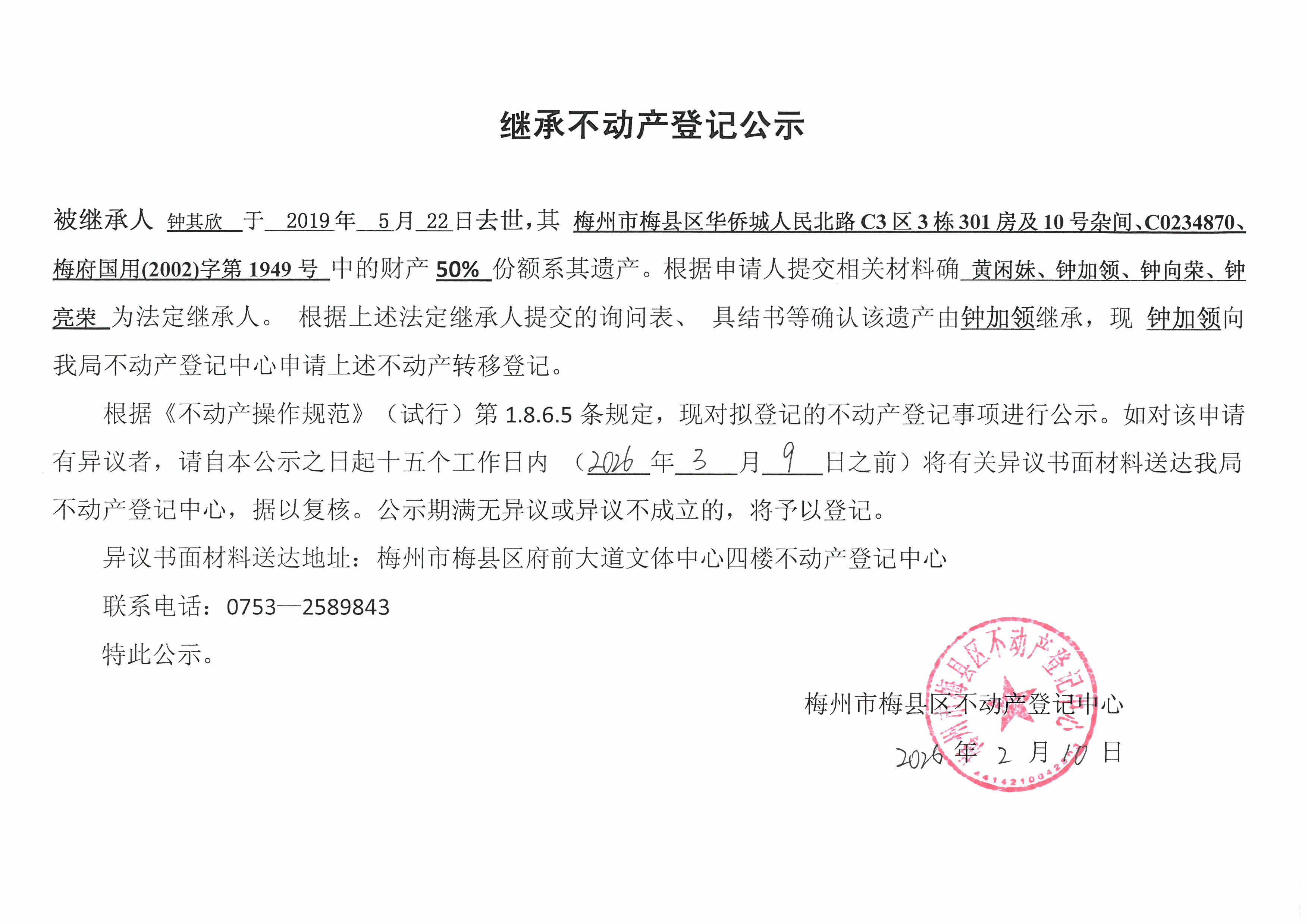 被继承人钟其欣于2019年5月22日去世,其梅州市梅县区华侨城人民北路C3区3栋301房及10号杂间、C0234870、梅府国用(2002)字第1949号中的财产50%份额系其遗产。根据申请人提交相关材料确认黄闲妹、钟加领、钟向荣、钟亮荣 为法定继承人。根据上述法定继承人提交的询问表、具结书等确认该遗产由钟加领继承,现钟加领向我局不动产登记中心申请上述不动产转移登记。