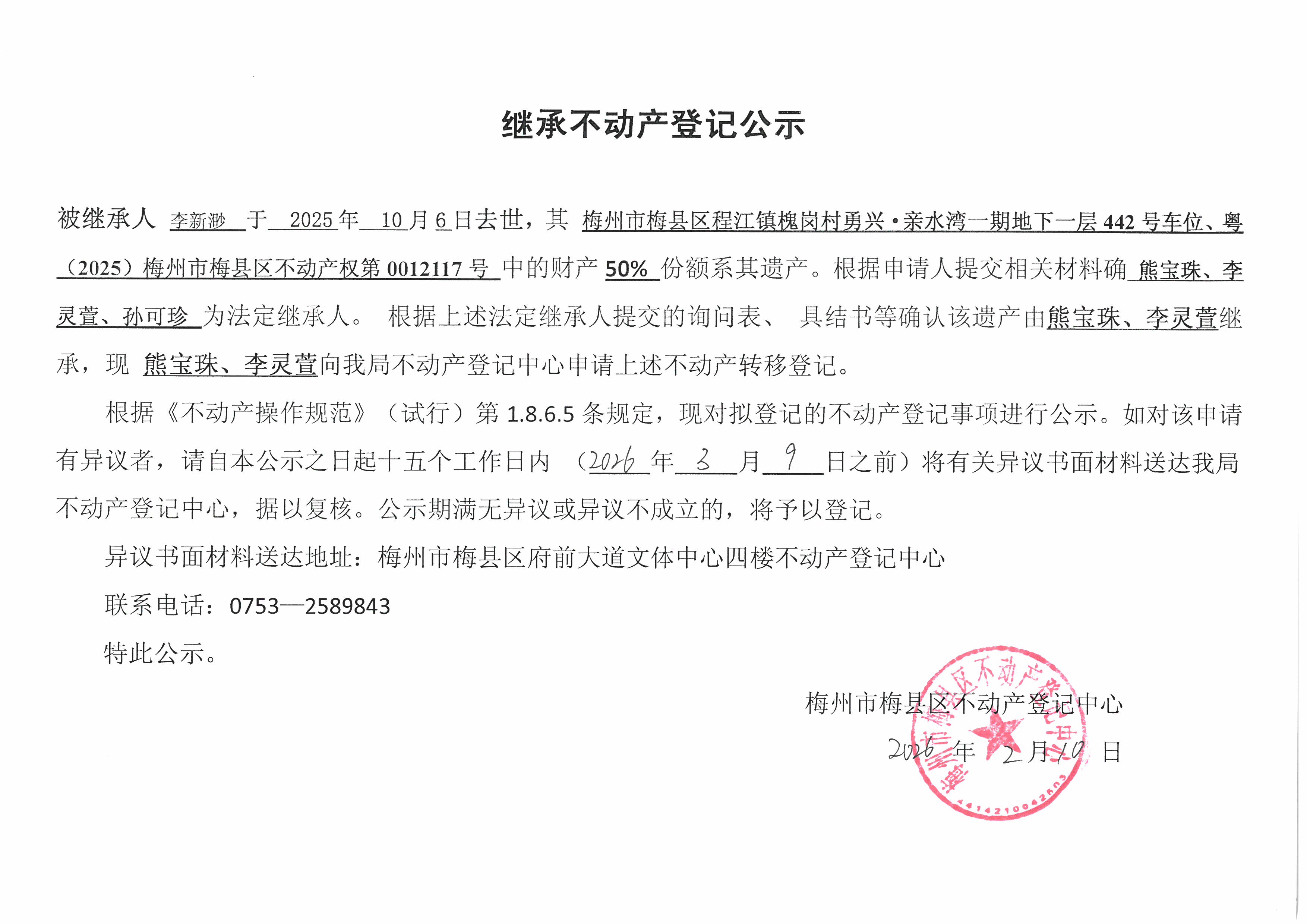 被继承人李新渺于2025年10月6日去世,其梅州市梅县区程江镇槐岗村勇兴·亲水湾一期地下一层442号车位、粤(2025)梅州市梅县区不动产权第0012117号中的财产50%份额系其遗产。根据申请人提交相关材料确认熊宝珠、李灵萱、孙可珍为法定继承人。根据上述法定继承人提交的询问表、具结书等确认该遗产由熊宝珠、李灵萱继承,现熊宝珠、李灵萱向我局不动产登记中心申请上述不动产转移登记。