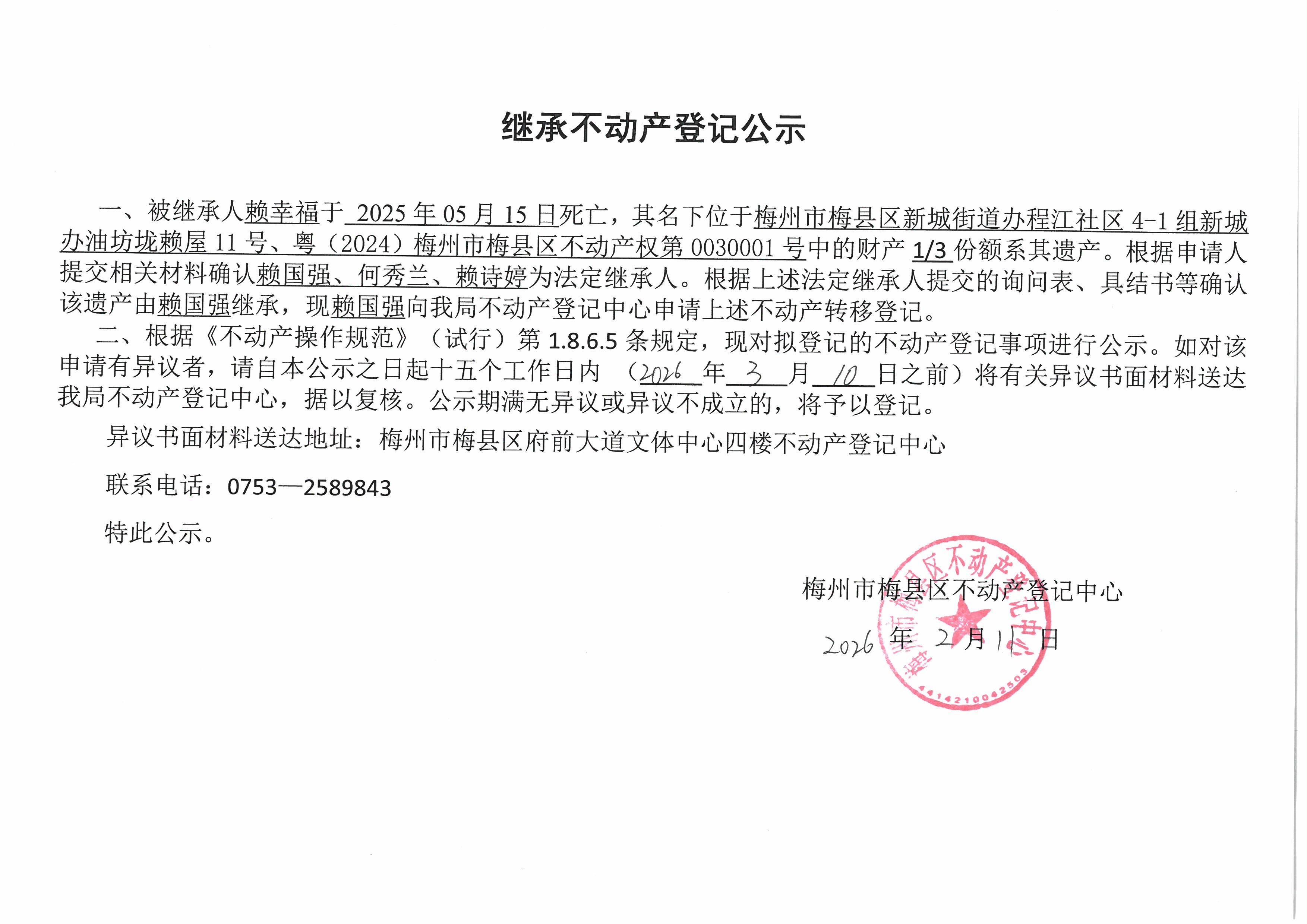 被继承人赖幸福于2025年05月15日死亡,其名下位于梅州市梅县区新城街道办程江社区4-1组新城办油坊垅赖屋11号、粤(2024)梅州市梅县区不动产权第0030001号中的财产 1/3 份额系其遗产。根据申请人提交相关材料确认赖国强、何秀兰、赖诗婷为法定继承人。根据上述法定继承人提交的询问表、具结书等确认该遗产由赖国强继承,现赖国强向我局不动产登记中心申请上述不动产转移登记。