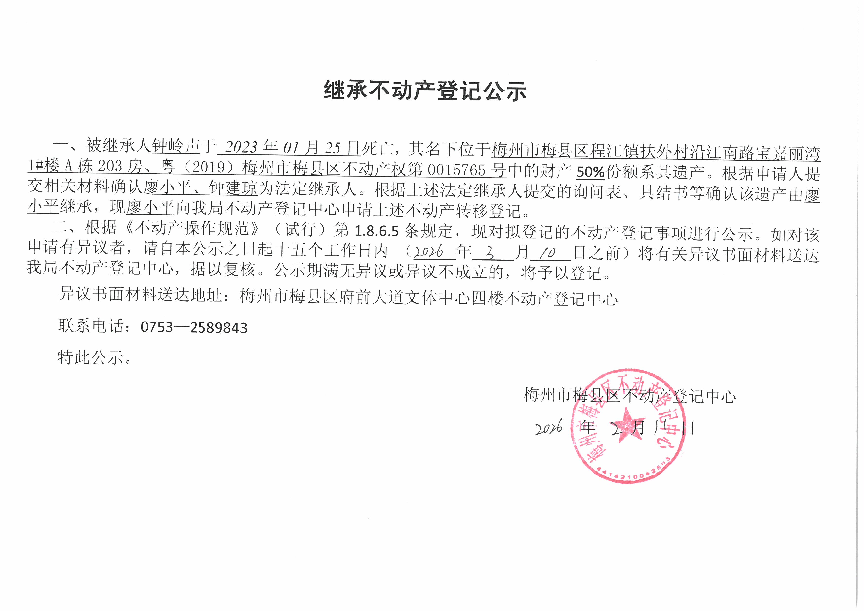 被继承人钟岭声于2023年01月25日死亡,其名下位于梅州市梅县区程江镇扶外村沿江南路宝嘉丽湾1#楼A栋203房、粤(2019)梅州市梅县区不动产权第0015765号中的财产50%份额系其遗产。根据申请人提交相关材料确认廖小平、钟建琼为法定继承人。根据上述法定继承人提交的询问表、具结书等确认该遗产由廖小平继承,现廖小平向我局不动产登记中心申请上述不动产转移登记。