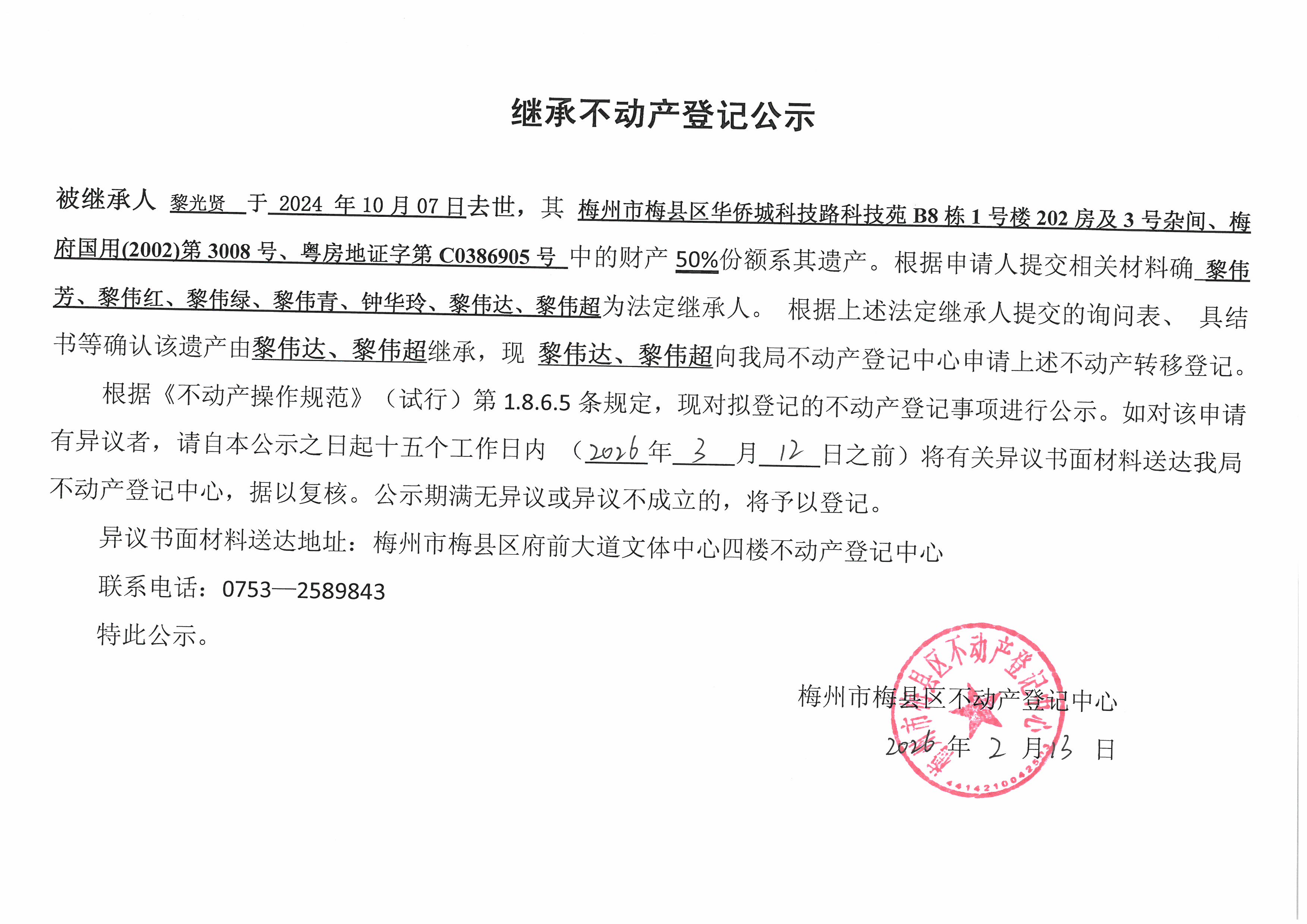 被继承人黎光贤于2024年10月07日去世,其梅州市梅县区华侨城科技路科技苑B8栋1号楼202房及3号杂间、梅府国用(2002)第3008号、粤房地证字第C0386905号中的财产50%份额系其遗产。根据申请人提交相关材料确黎伟芳、黎伟红、黎伟绿、黎伟青、钟华玲、黎伟达、黎伟超为法定继承人。根据上述法定继承人提交的询问表、具结书等确认该遗产由黎伟达、黎伟超继承,现黎伟达、黎伟超向我局不动产登记中心申请上述不动产转移登记。