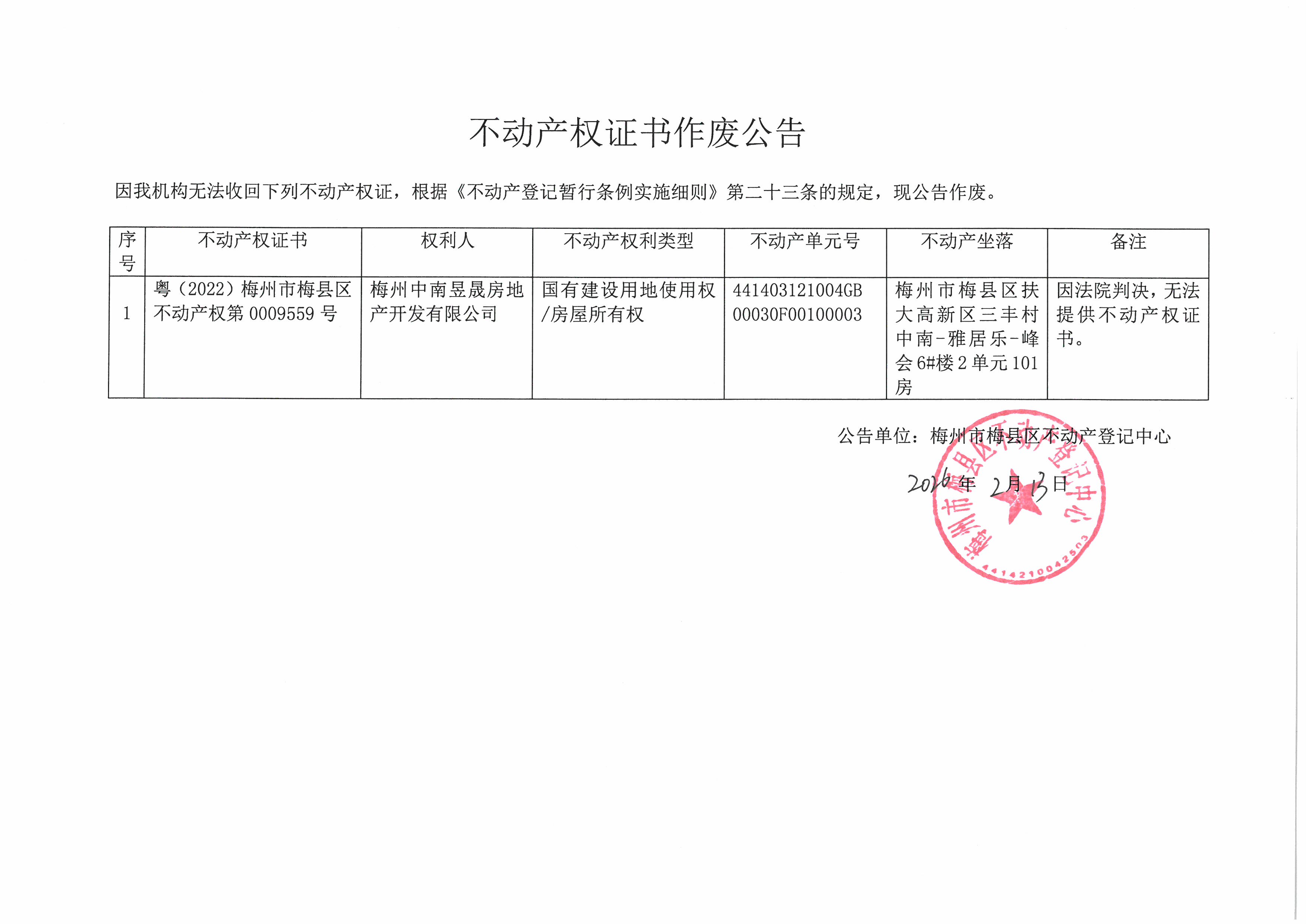 1 | 粤(2022)梅州市梅县区不动产权第0009559号 | 梅州中南昱晟房地产开发有限公司 | 国有建设用地使用权/房屋所有权 | 441403121004GB 00030F00100003 | 梅州市梅县区扶大高新区三丰村中南-雅居乐-峰会6#楼2单元101房 | 因法院判决,无法提供不动产权证书。 |