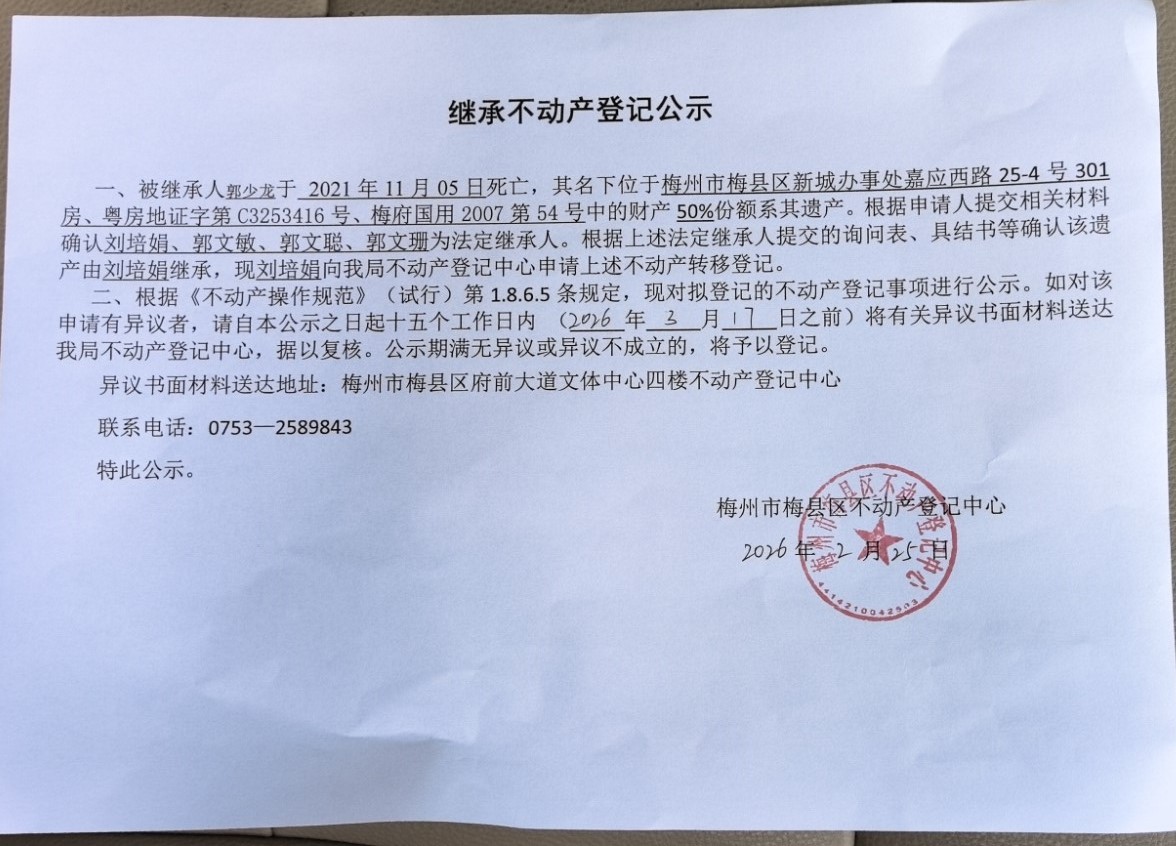 被继承人郭少龙于2021年11月05日死亡,其名下位于梅州市梅县区新城办事处嘉应西路25-4号301房、粤房地证字第C3253416号、梅府国用2007第54号中的财产50%份额系其遗产。根据申请人提交相关材料确认刘培娟、郭文敏、郭文聪、郭文珊为法定继承人。根据上述法定继承人提交的询问表、具结书等确认该遗产由刘培娟继承,现刘培娟向我局不动产登记中心申请上述不动产转移登记。