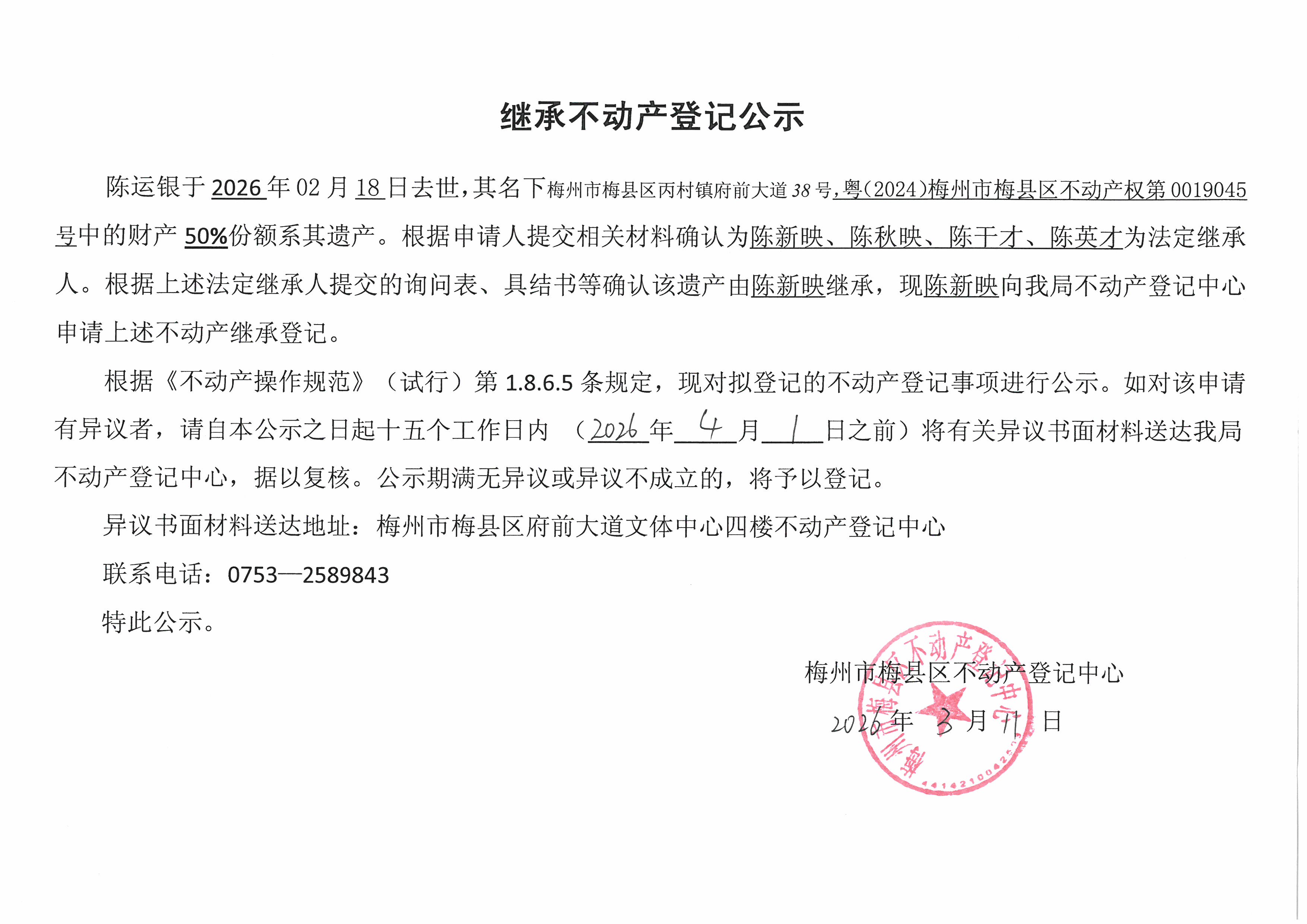 陈运银于2026年02月18日去世,其名下梅州市梅县区丙村镇府前大道38号,粤(2024)梅州市梅县区不动产权第0019045号中的财产50%份额系其遗产。根据申请人提交相关材料确认为陈新映、陈秋映、陈干才、陈英才为法定继承人。根据上述法定继承人提交的询问表、具结书等确认该遗产由陈新映继承,现陈新映向我局不动产登记中心申请上述不动产继承登记。