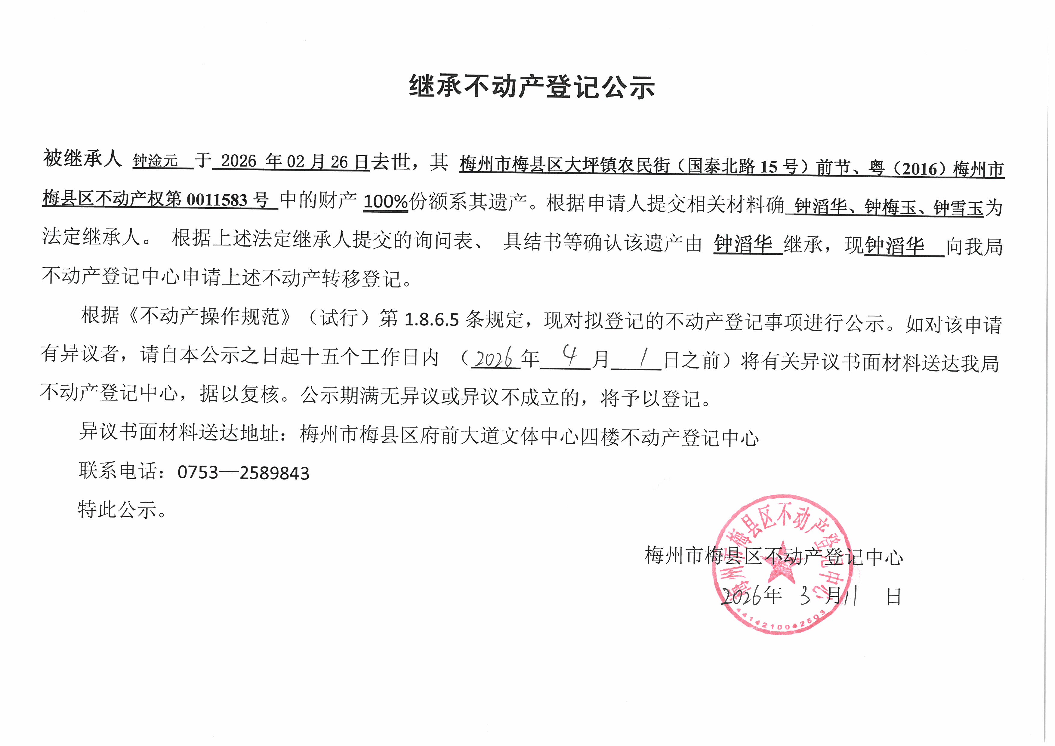被继承人钟淦元于2026年02月26日去世,其梅州市梅县区大坪镇农民街(国泰北路15号)前节、粤(2016)梅州市梅县区不动产权第0011583号中的财产100%份额系其遗产。根据申请人提交相关材料确钟滔华、钟梅玉、钟雪玉为法定继承人。根据上述法定继承人提交的询问表、具结书等确认该遗产由钟滔华,现钟滔华我局不动产登记中心申请上述不动产转移登记。