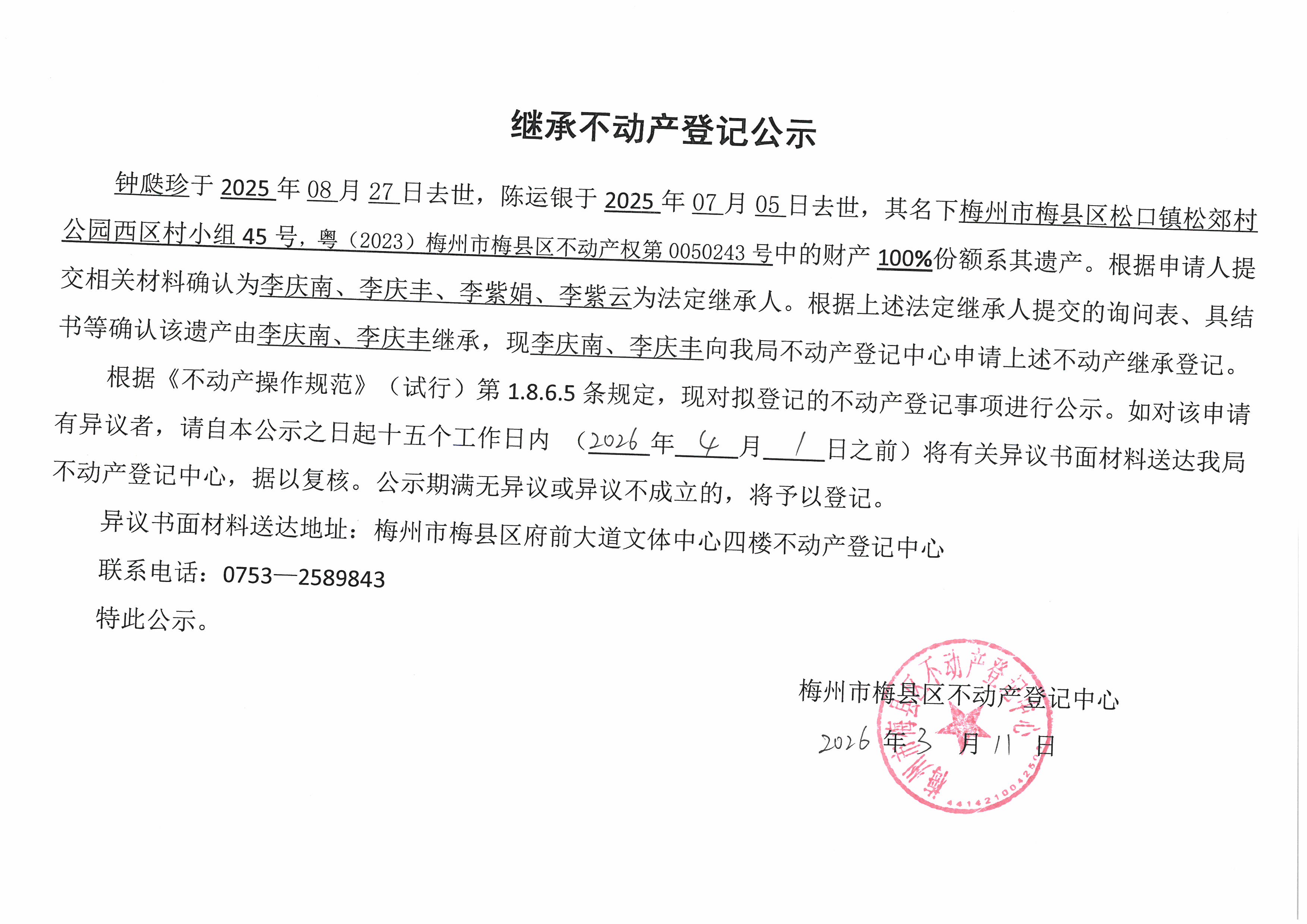 钟瓞珍于2025年08月27日去世,陈运银于2025年07月05日去世,其名下梅州市梅县区松口镇松郊村公园西区村小组45号,粤(2023)梅州市梅县区不动产权第0050243号中的财产100%份额系其遗产。根据申请人提交相关材料确认为李庆南、李庆丰、李紫娟、李紫云为法定继承人。根据上述法定继承人提交的询问表、具结书等确认该遗产由李庆南、李庆丰继承,现李庆南、李庆丰向 我局不动产登记中心申请上述不动产继承登记。