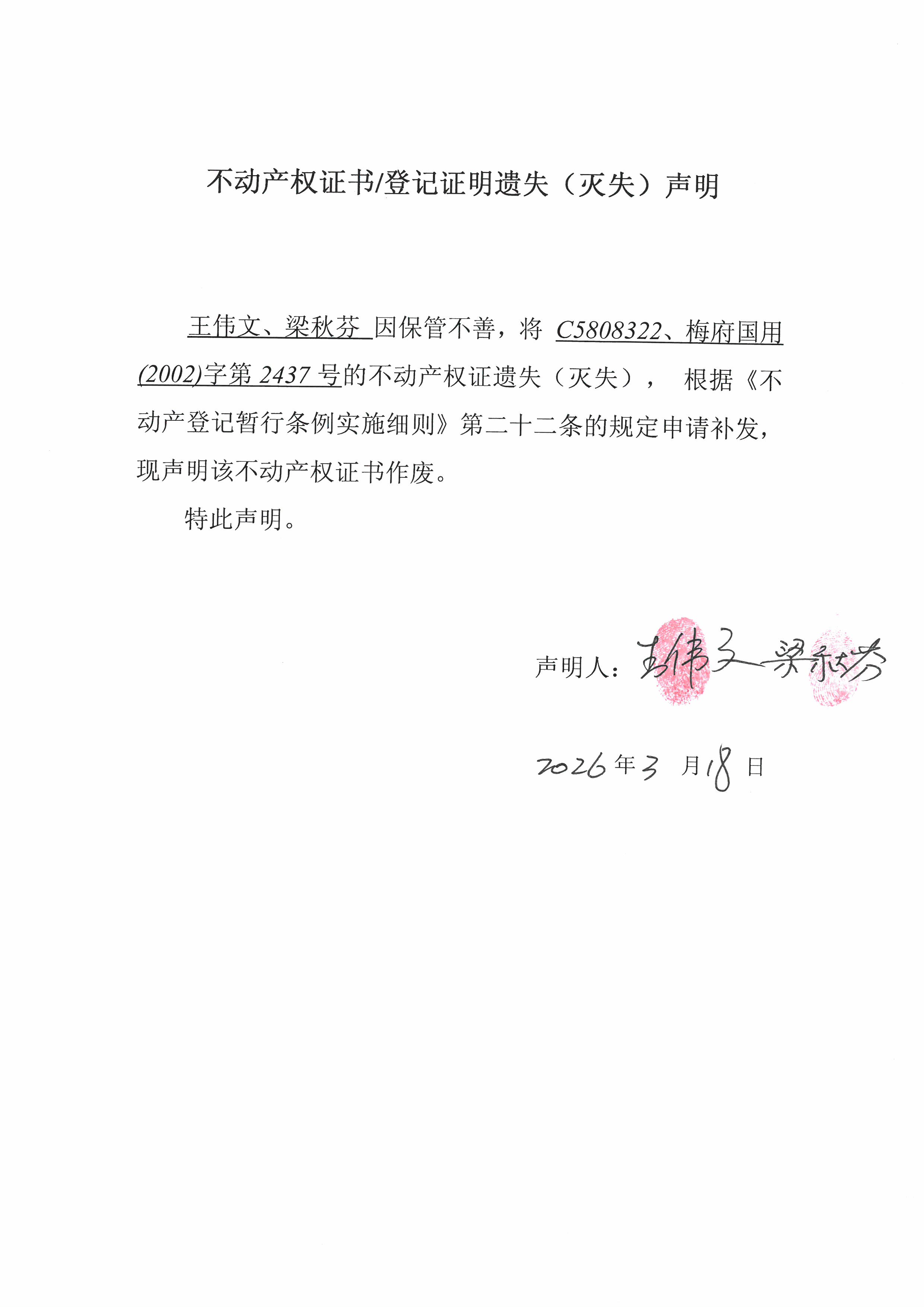 王伟文、梁秋芬因保管不善,将C5808322、梅府国用(2002)字第2437号的不动产权证遗失(灭失),根据《不动产登记暂行条例实施细则》第二十二条的规定申请补发现声明该不动产权证书作废。