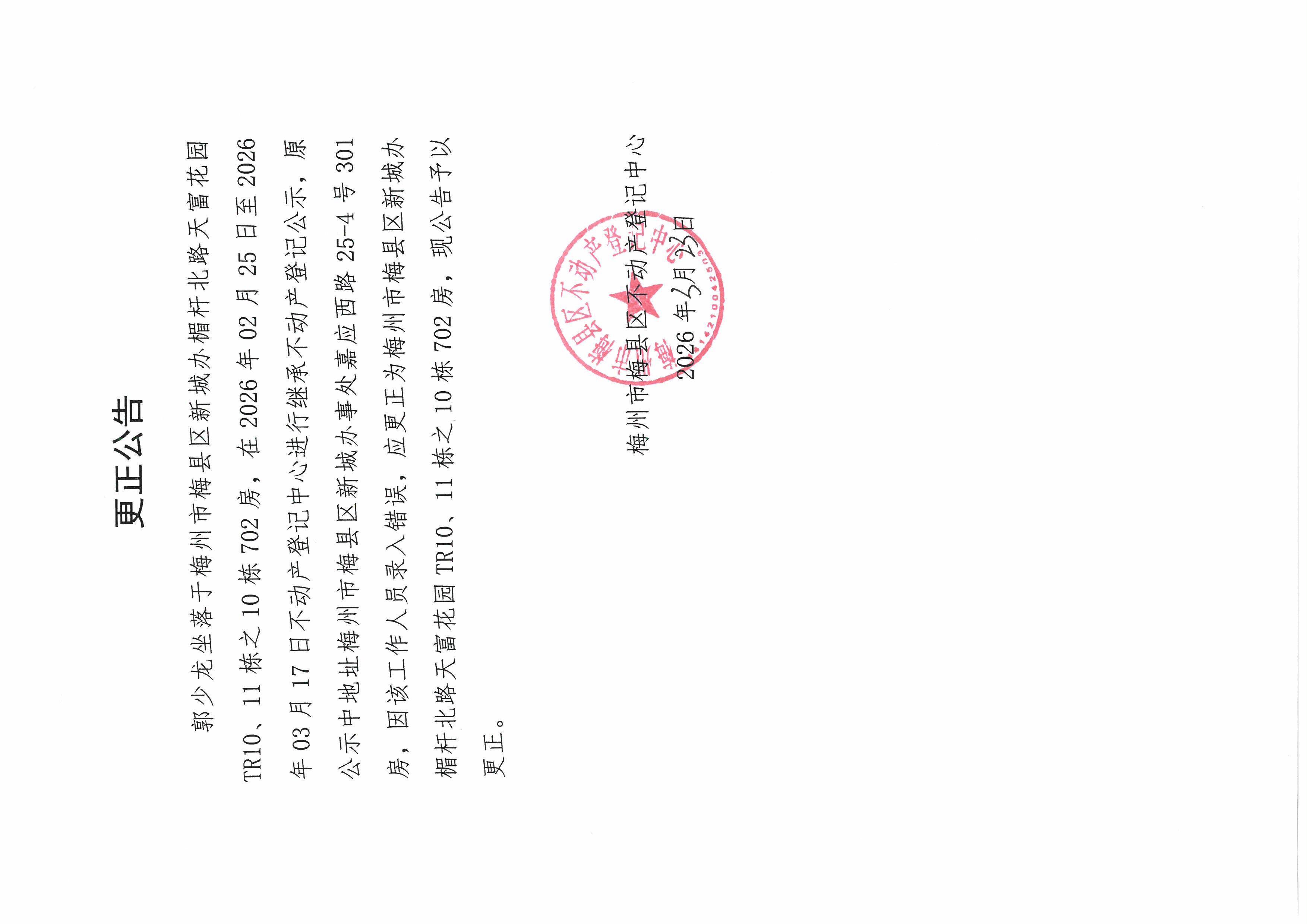 郭少龙坐落于梅州市梅县区新城办楣杆北路天富花园TR10、11栋之10栋702房,在2026年02月25日至2026年03月17日不动产登记中心进行继承不动产登记公示,原公示中地址梅州市梅县区新城办事处嘉应西路25-4号301房,因该工作人员录入错误,应更正为梅州市梅县区新城办楣杆北路天富花园TR10、11栋之10栋702房,现公告予以更正。