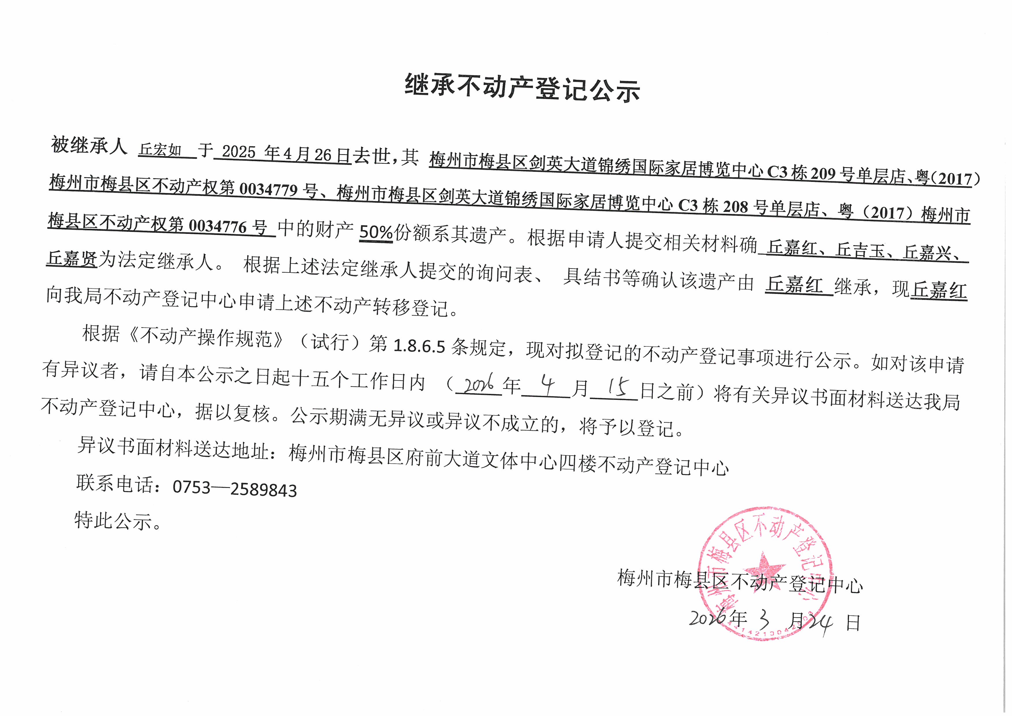 被继承人丘宏如于2025年4月26日去世,其梅州市梅县区剑英大道锦绣国际家居博览中心C3栋209号单层店、粤(2017)梅州市梅县区不动产权第0034779号、梅州市梅县区剑英大道锦绣国际家居博览中心C3栋208号单层店、粤(2017)梅州市梅县区不动产权第0034776号中的财产50%份额系其遗产。根据申请人提交相关材料确丘嘉红、丘吉玉、丘嘉兴、丘嘉贤为法定继承人。根据上述法定继承人提交的询问表、具结书等确认该遗产由丘嘉红继承,现丘嘉红向我局不动产登记中心申请上述不动产转移登记。
