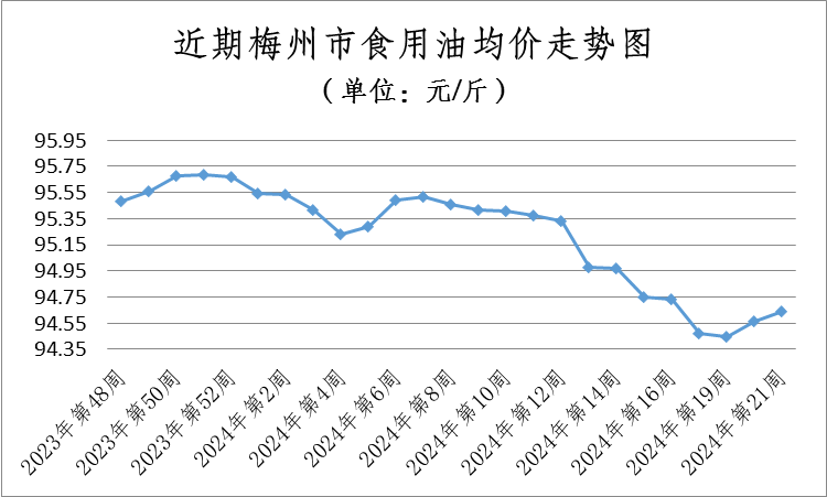 粮油价格保持稳定。本周粮食均价为3.14元/斤,环比(与2024年第20周相比,下同)持平;食用油均价为94.64元/桶(5L),环比上升0.08%。