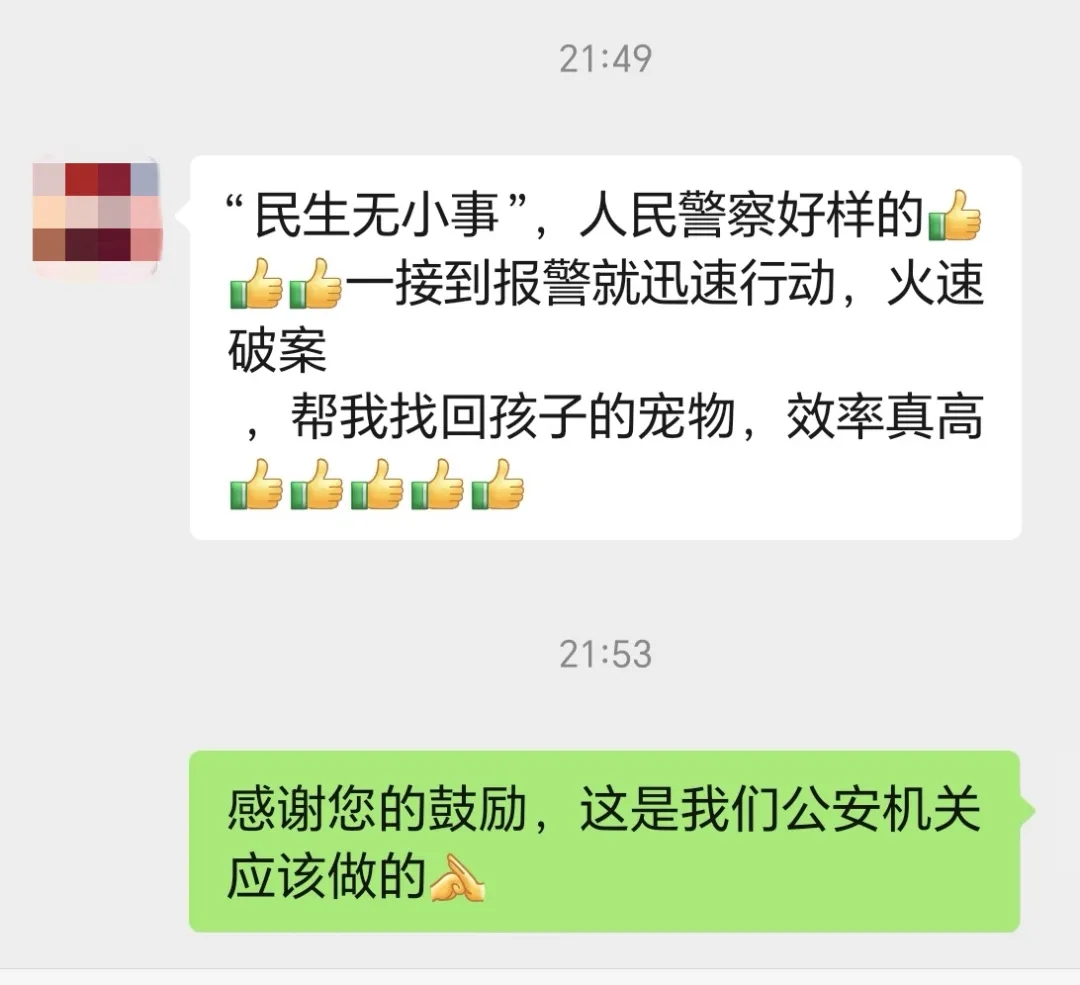 接报后,值班民警立即着手展开调查,迅速调取现场及周边监控视频进行排查,并在分局侦查中心的支持下,很快锁定了盗鸭的陈某。当日15时许,民警找到陈某,并追回了被盗的2只宠物鸭。经了解,陈某路过店铺门口时,见两只鸭子长得肥美可爱,一时心动,便趁无人注意实施了偷窃。庆幸的是,两只鸭子仍活蹦乱跳,未成为“盘中鸭”。 宠物鸭的失而复得,让宋女士及其女儿倍感欣喜。宋女士特意在微信朋友圈发文,对公安机关快速破案、一心为民的工作作风表示衷心感谢,并向办案民警发送了一段感谢话语。这份来自群众的肯定,是对公安工作最大的鼓励和支持。