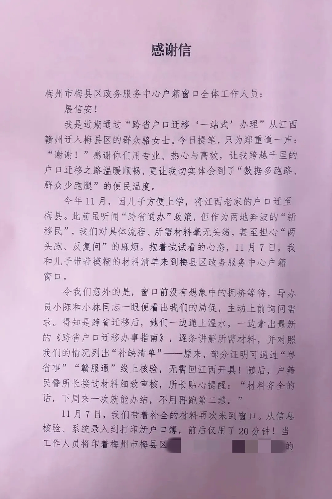 近日,梅县公安政务服务中心收到群众骆女士的感谢信,感谢程江派出所户籍窗口工作人员帮助其与儿子快速办理跨省户籍迁移业务,保障了孩子的高考报名,对窗口工作人员专业、高效、贴心的服务表达深深谢意。