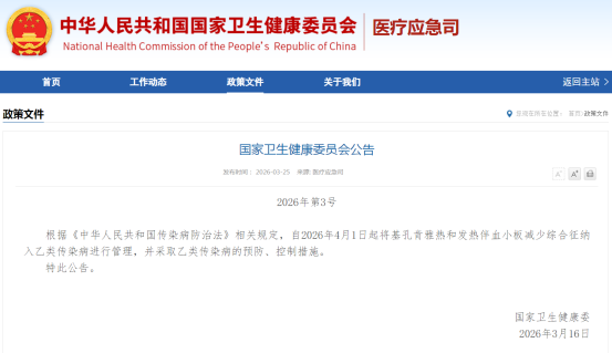 3月25日,国家卫生健康委发布公告,根据《中华人民共和国传染病防治法》相关规定,自2026年4月1日起将基孔肯雅热和发热伴血小板减少综合征纳入乙类传染病进行管理,并采取乙类传染病的预防、控制措施。