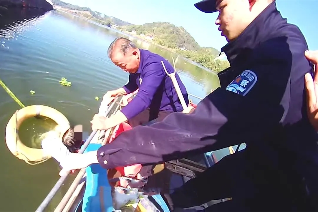时间就是生命,接到报警后,吴文希、杨文俊立即赶往事发地点。抵达现场后,发现离岸6米左右的梅江河中,一名身穿蓝色羽绒服的女孩头朝下漂浮着,身体还在不断向河中央漂移,随时可能被水流卷向深处,情况万分危急。 危急时刻,吴文希、杨文俊发现河边停有一艘平板小船,两人不顾自身安危,当即纵身跳上小船,与热心群众一起手持竹篙,奋力将小船向溺水女孩方向划去。河面有暗流,小船摇晃不定,随时有翻船风险,但两人丝毫没有退缩,凭借着沉着冷静,合力将溺水女孩小心翼翼拉上小船。经初步检查,女孩意识清醒,暂无生命危险,众人悬着的心才稍稍放下。 小船靠岸后,闻讯赶来的女孩家属看到孩子安然无恙,激动得热泪盈眶,紧紧握住民警的手连声道谢。平凡岗位显担当,危难时刻见真情。一场与时间赛跑的紧急救援,彰显了民辅警的责任与担当,也见证了警民同心的温暖力量。 民警提醒:广大群众要加强对未成年人的监护,时刻看管好孩子,避免孩子私自靠近河边,防止溺水事故发生。若发现有人溺水,切勿盲目下水救援,应及时拨打110、120求助,并确保自身安全的前提下,利用身边现有工具(如竹竿、绳索、船只等)开展岸上救援。