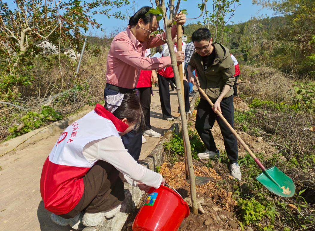 植树现场,春光明媚。人才代表们三五成群、分工协作,挥锹挖坑、扶苗培土、提水浇灌,干劲十足,现场气氛热烈而有序。大家齐心协力种下玉堂春等苗木120余株,为初春的梅南增添勃勃生机,也寓意着人才在梅县这片热土上扎根成长、开花结果。