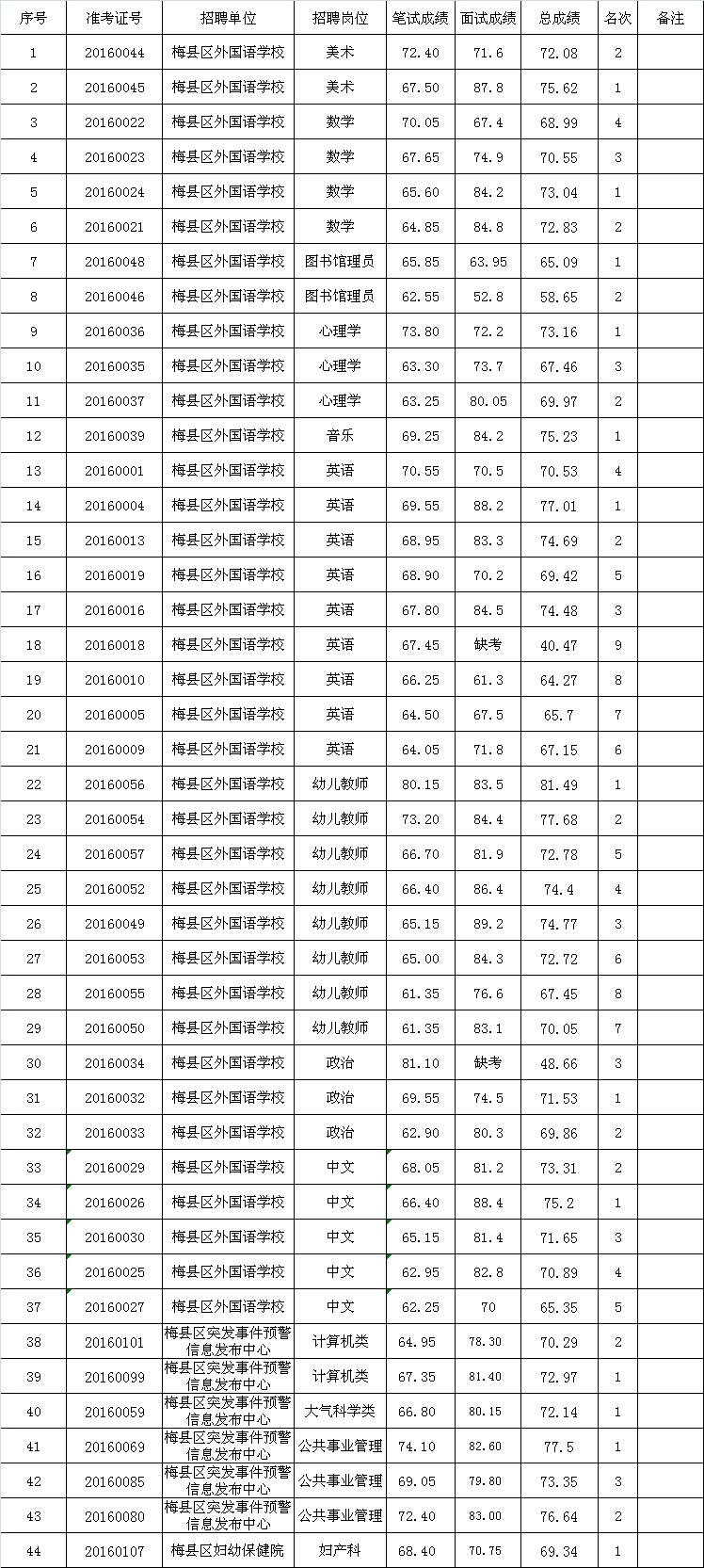 2016年梅县区公开招聘事业单位工作人员总成绩