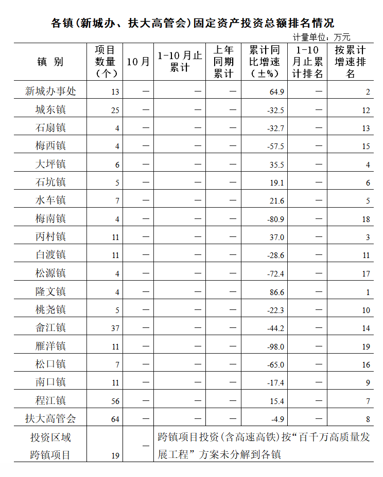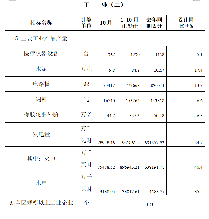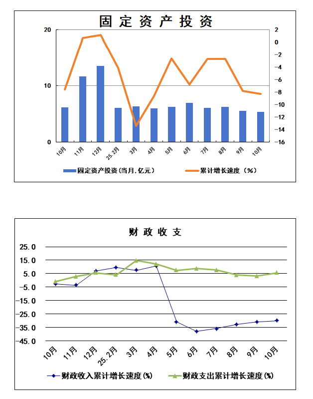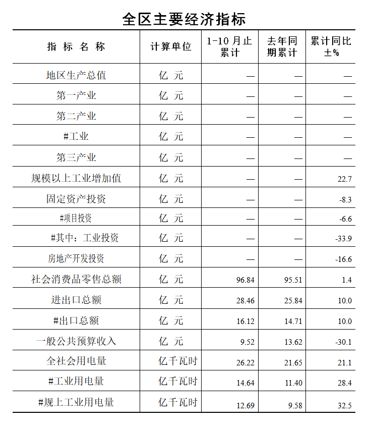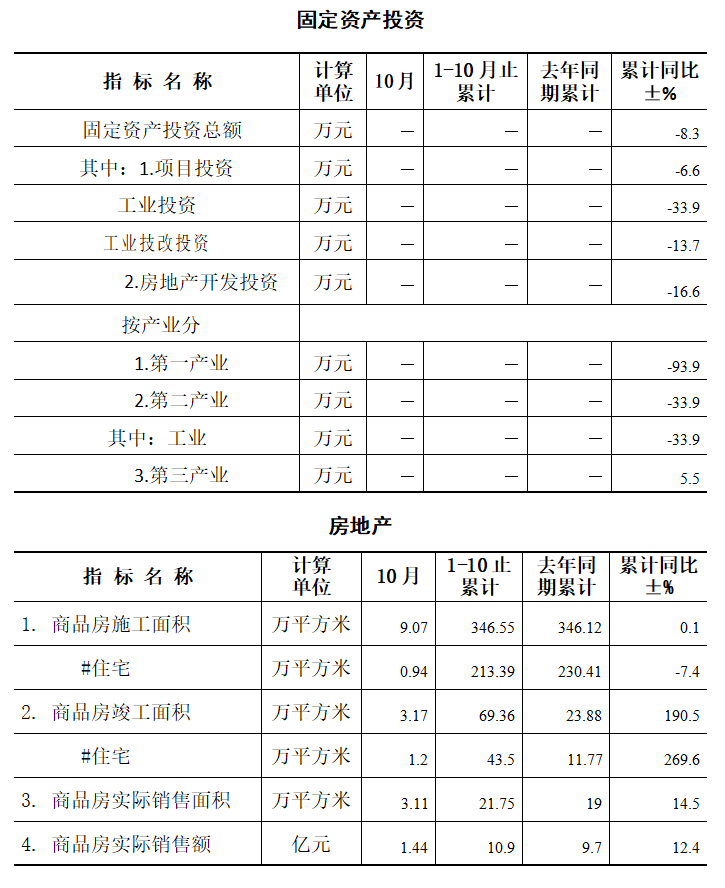 1-10月,全区固定资产投资同比下降8.3%,其中:项目投资同比下降6.6%;项目投资中,工业投资同比下降33.9%;技改投资同比下降13.7%;房地产投资同比下降16.6%。