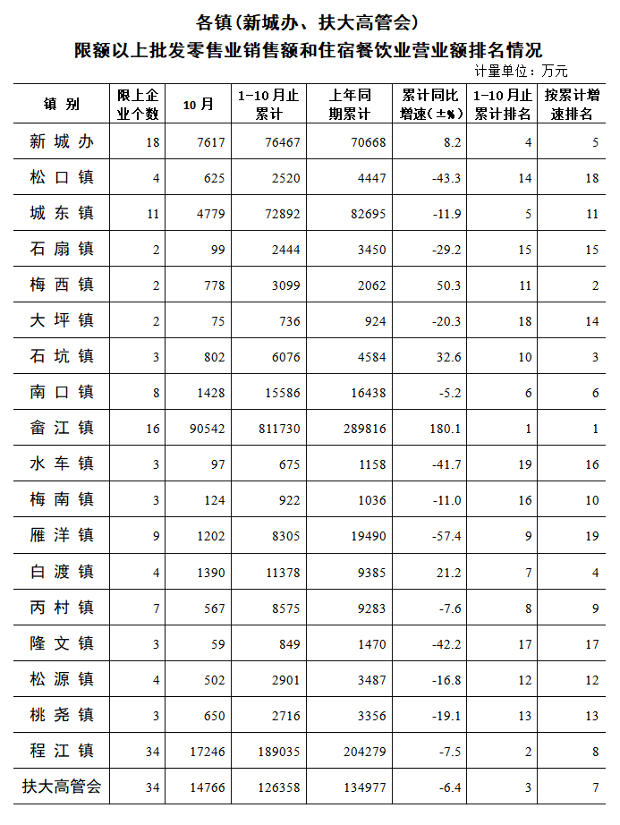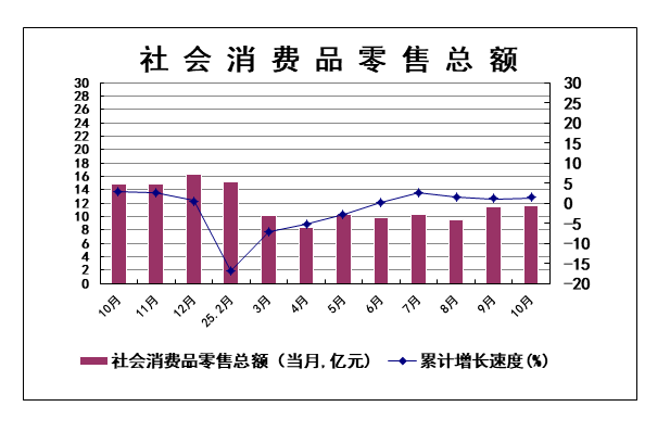 1-10月,全区实现社会消费品零售总额96.84亿元,同比增长1.4%。从经营单位所在地看:城镇实现消费品零售总额78.39亿元,同比上升1.4%;乡村市场社会零售总额18.45亿元,同比增长1.4%。从消费形态看:商品零售额89.54亿元,同比增长1.7%;餐饮收入7.30亿元,同比下降2.2%。从销售规模上来看,限额以上法人单位实现零售额29.13亿元,同比增长1%。