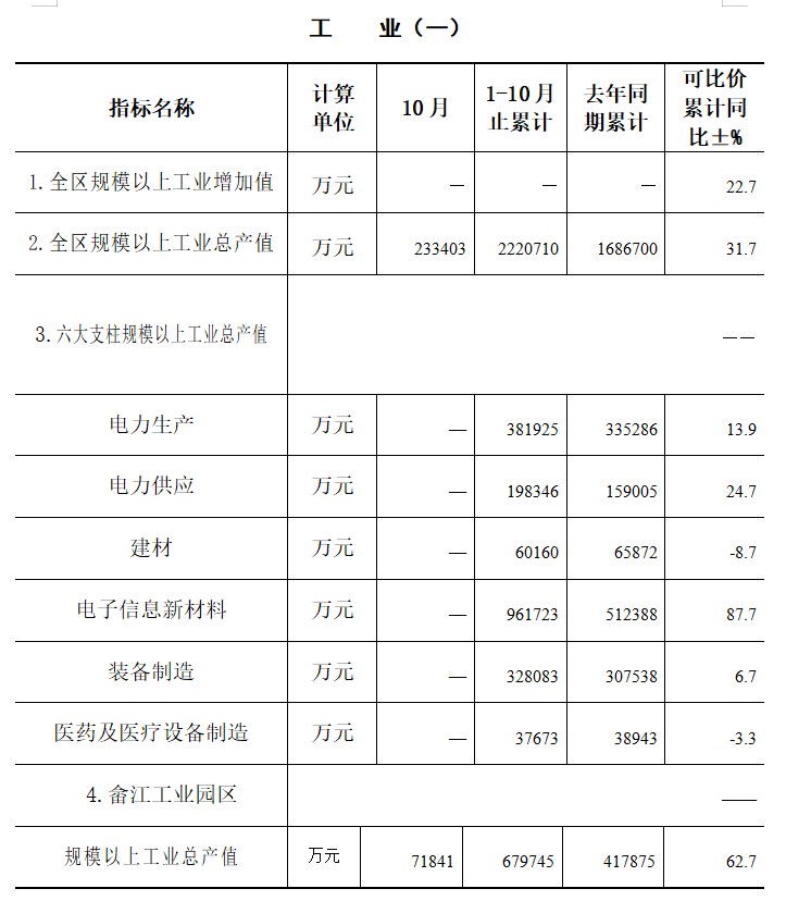 1-10月,全区规模以上工业企业实现总产值222.07亿元,同比增长31.7%;实现工业增加值同比增长22.7%,位居全市第一。