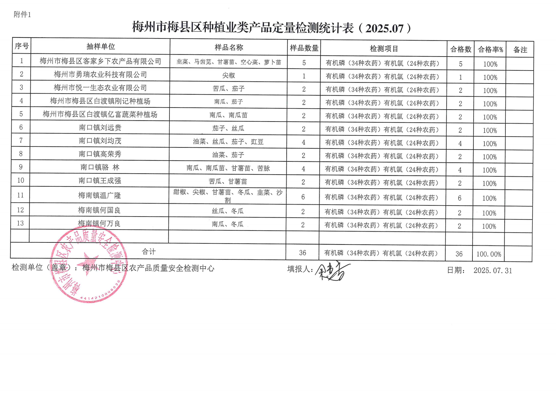 梅州市梅县区种植业类产品定量检测统计表(2025.7)