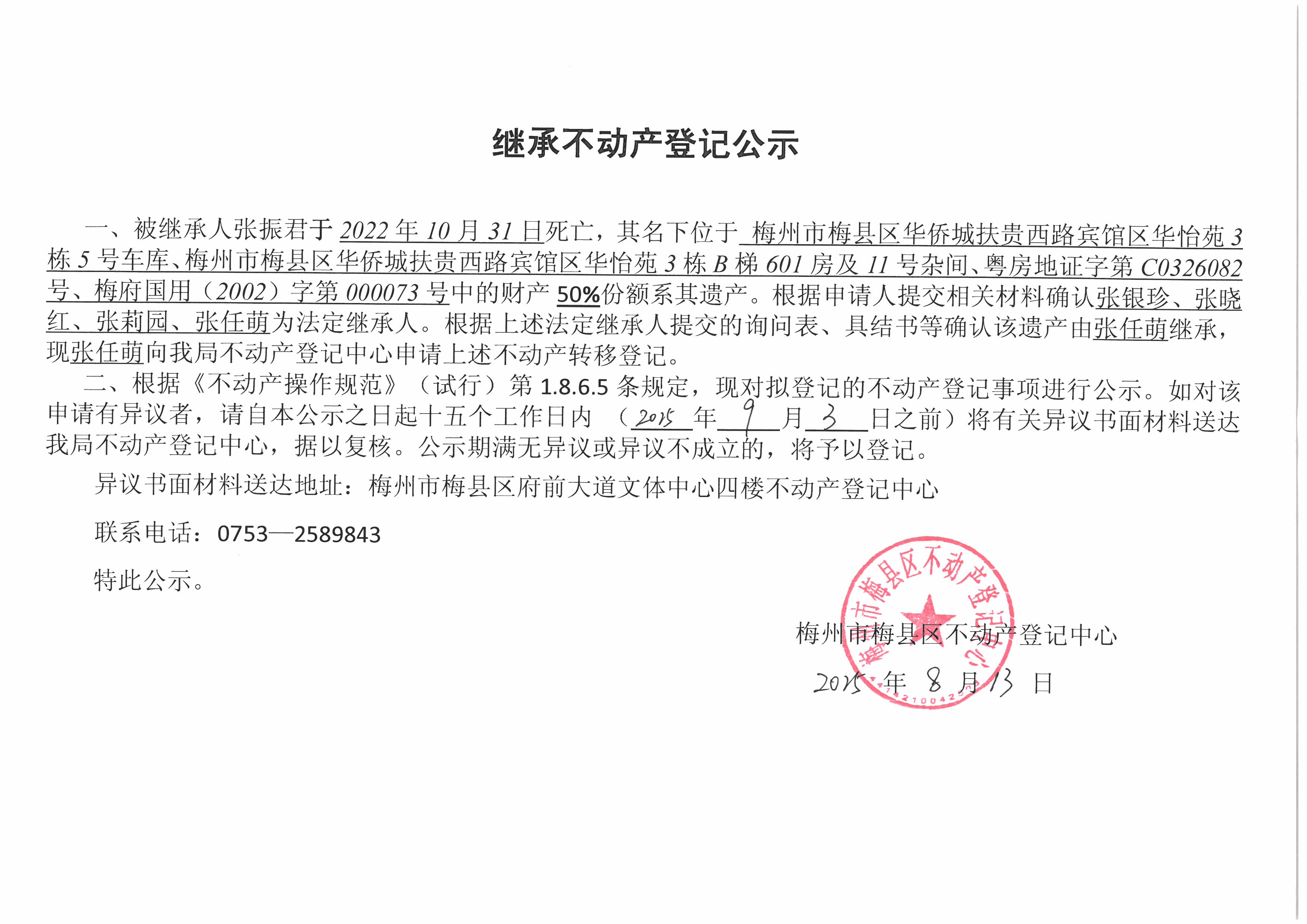 被继承人张振君于2022年10月31日死亡,其名下位于梅州市梅县区华侨城扶贵西路宾馆区华怡苑3栋5号车库、梅州市梅县区华侨城扶贵西路宾馆区华怡苑3栋B梯601房及11号杂间、粤房地证字第C0326082号、梅府国用(2002)字第 000073号中的财产50%份额系其遗产。根据申请人提交相关材料确认张银珍、张晓红、张莉园、张任萌为法定继承人。根据上述法定继承人提交的询问表、具结书等确认该遗产由张任萌继承,现张任萌向我局不动产登记中心申请上述不动产转移登记。