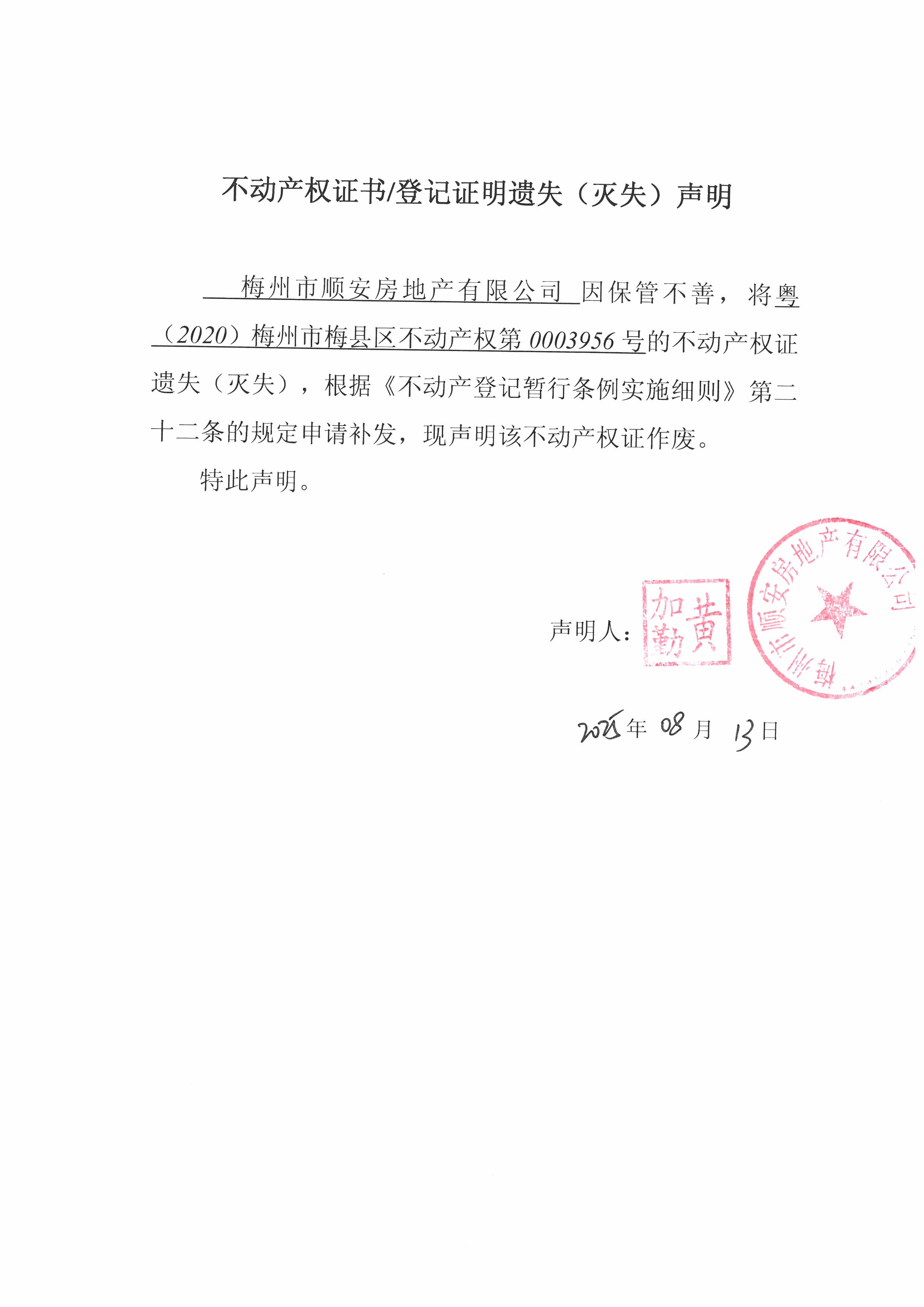 梅州市顺安房地产有限公司 因保管不善,将粤(2020)梅州市梅县区不动产权第0003956号的不动产权证遗失(灭失),根据《不动产登记暂行条例实施细则》第二十二条的规定申请补发,现声明该不动产权证作废。