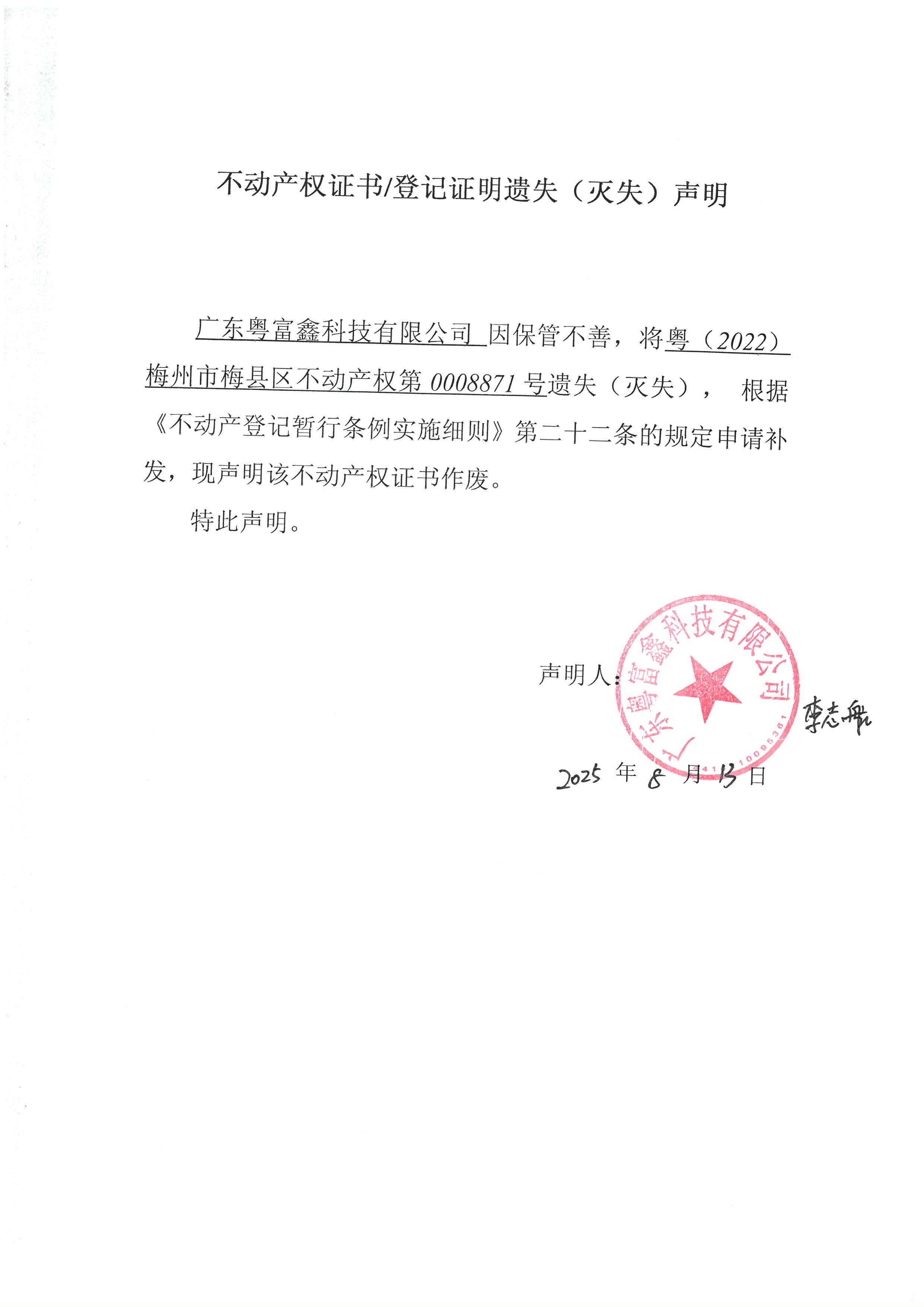 广东粤富鑫科技有限公司 因保管不善,将粤(2022)梅州市梅县区不动产权第0008871号遗失(灭失),根据《不动产登记暂行条例实施细则》第二十二条的规定申请补发,现声明该不动产权证书作废。