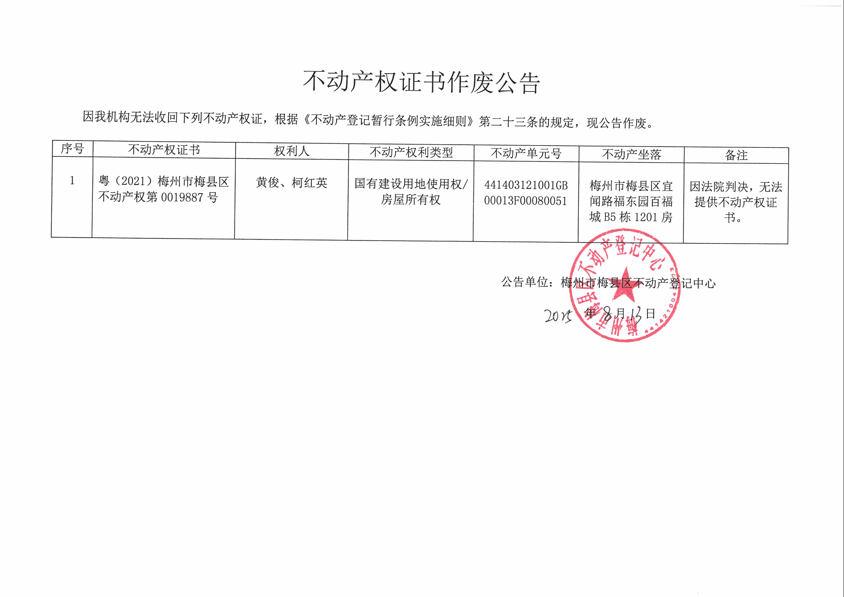 因我机构无法收回下列不动产权证,根据《不动产登记暂行条例实施细则》第二十三条的规定,现公告作废。