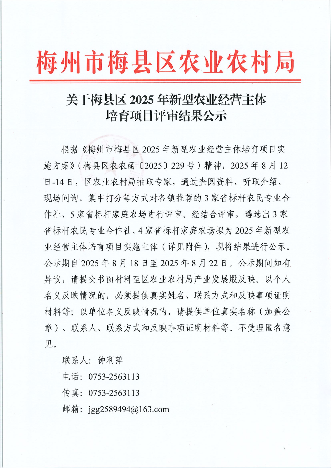 关于梅县区2025年新型农业经营主体培育项目评审结果公示