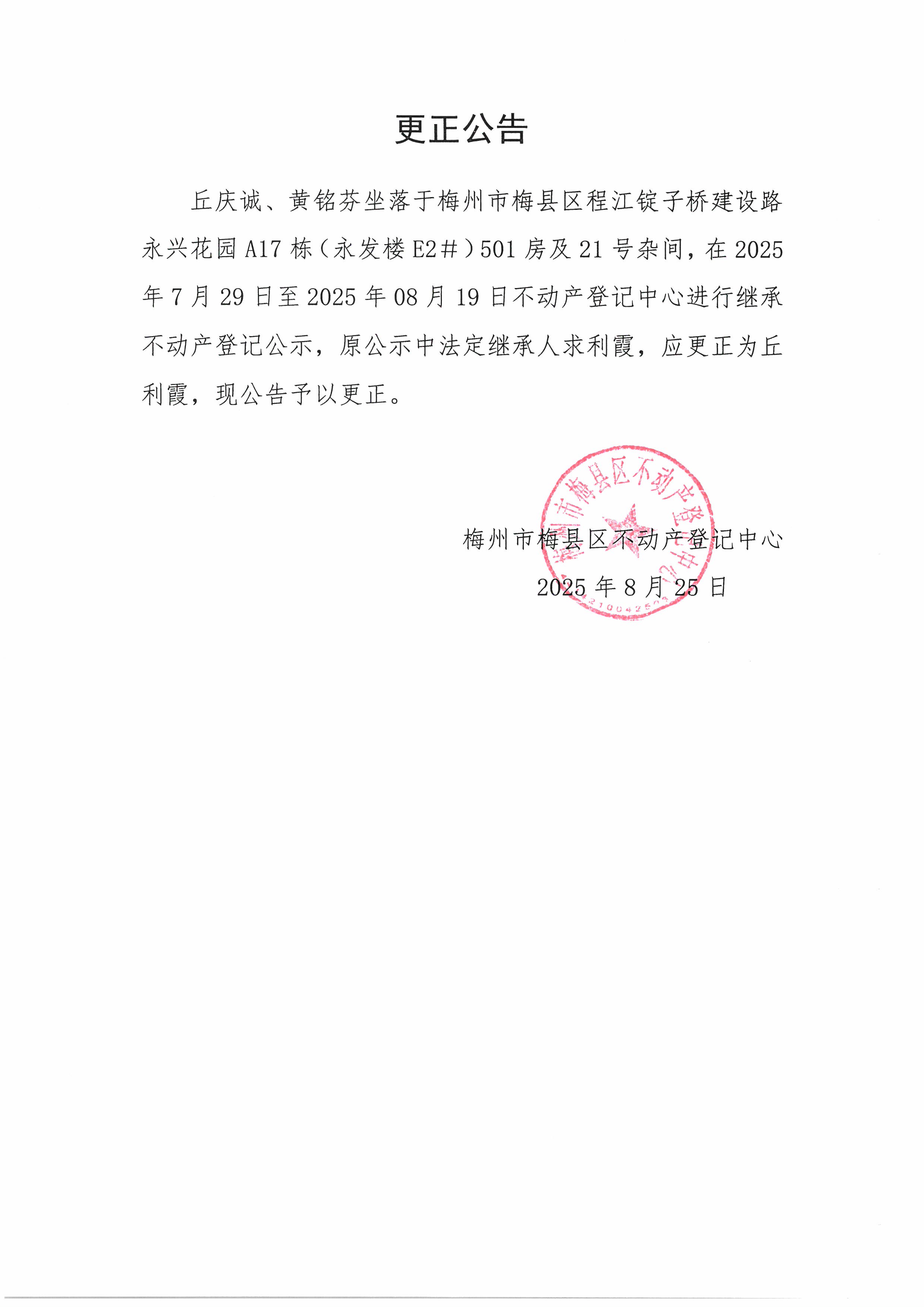 丘庆诚、黄铭芬坐落于梅州市梅县区程江锭子桥建设路永兴花园A17栋(永发楼E2#)501房及21号杂间,在2025年7月29日至2025年08月19日不动产登记中心进行继承不动产登记公示,原公示中法定继承人求利霞,应更正为丘利霞,现公告予以更正。