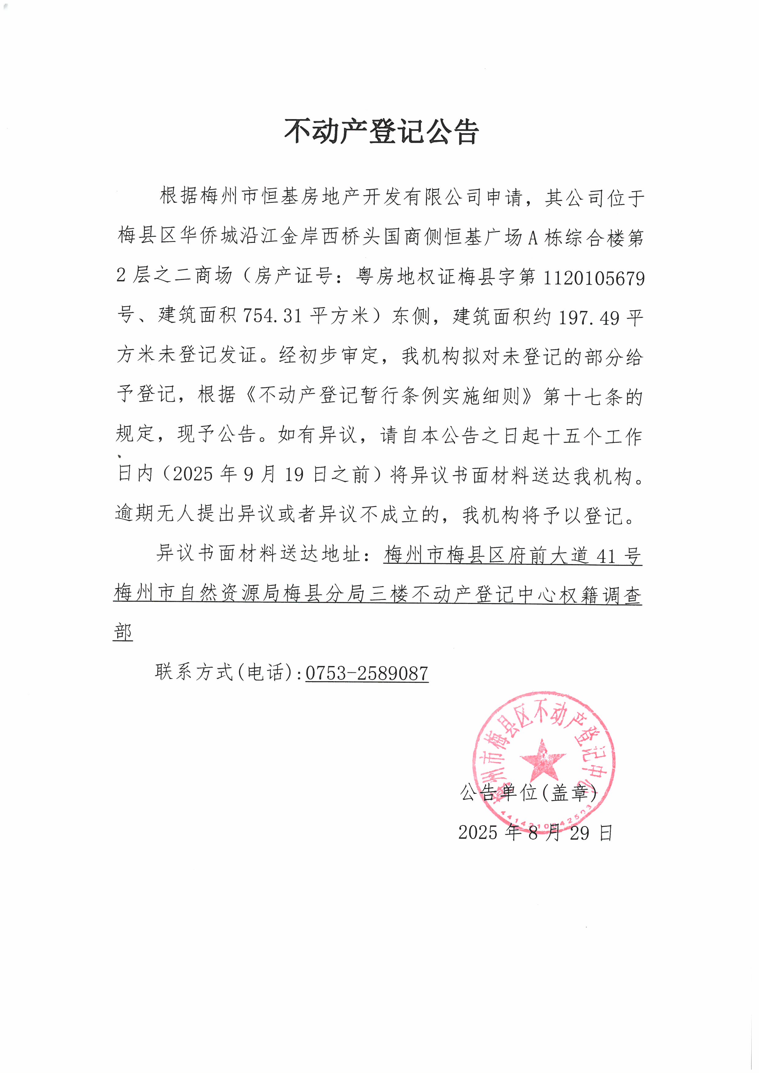 根据梅州市恒基房地产开发有限公司申请,其公司位于梅县区华侨城沿江金岸西桥头国商侧恒基广场A栋综合楼第2层之二商场(房产证号:粤房地权证梅县字第1120105679号、建筑面积754.31平方米)东侧,建筑面积约197.49平方米未登记发证。经初步审定,我机构拟对未登记的部分给予登记,根据《不动产登记暂行条例实施细则》第十七条的规定,现予公告。如有异议,请自本公告之日起十五个工作日内(2025年9月19日之前)将异议书面材料送达我机构。逾期无人提出异议或者异议不成立的,我机构将予以登记。