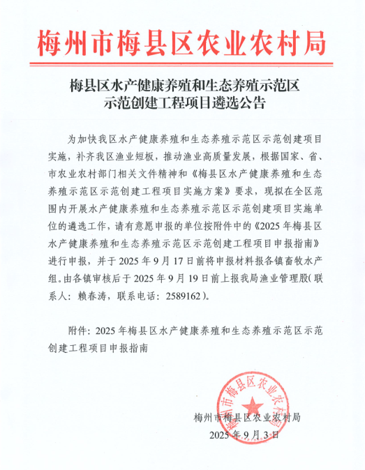 梅县区水产健康养殖和生态养殖示范区示范创建工程项目遴选公告