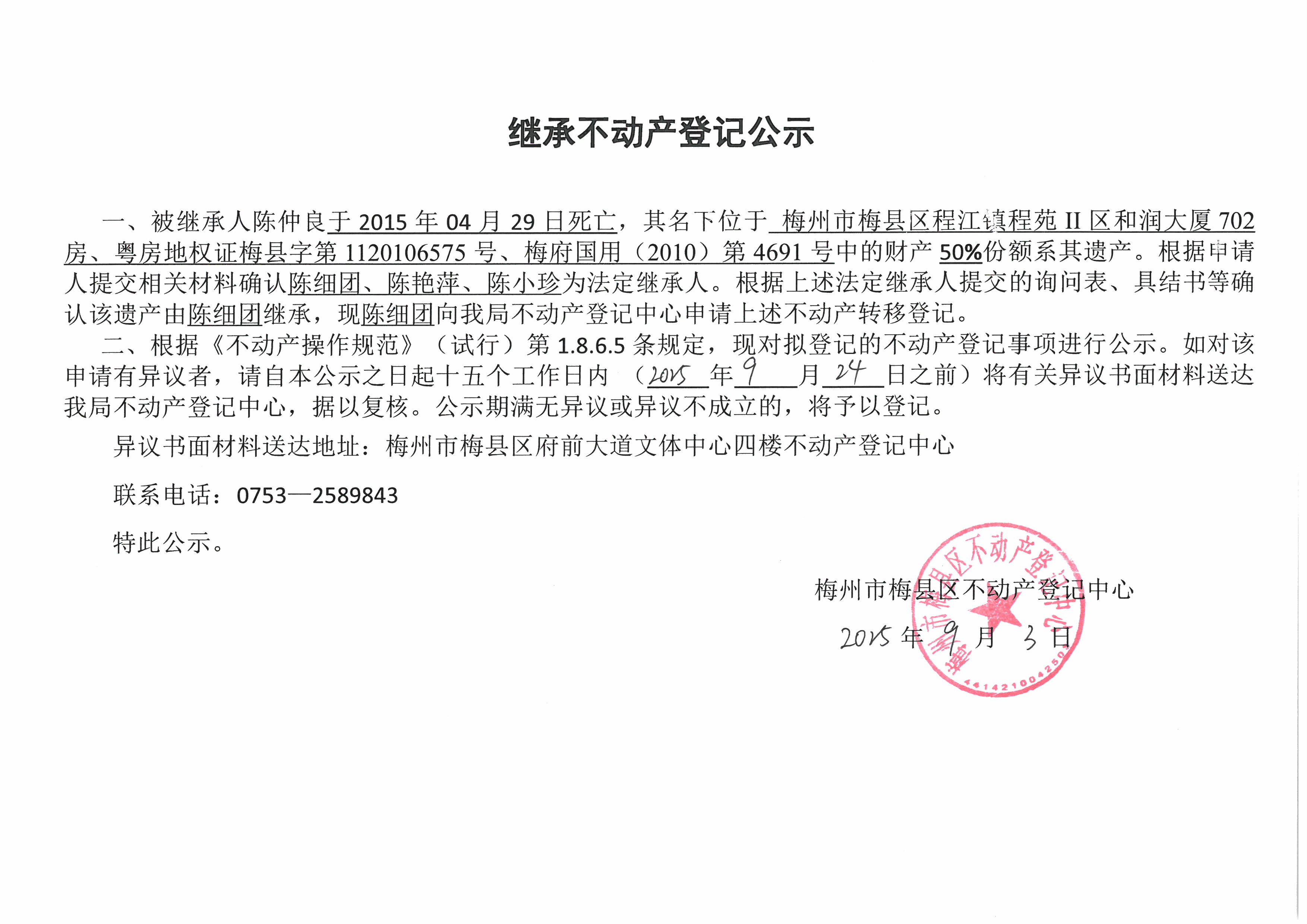 被继承人陈仲良于2015年04月29日死亡,其名下位于梅州市梅县区程江镇程苑Ⅱ区和润大厦702房、粤房地权证梅县字第1120106575号、梅府国用(2010)第4691号中的财产50%份额系其遗产。根据申请人提交相关材料确认陈细团、陈艳萍、陈小珍为法定继承人。根据上述法定继承人提交的询问表、具结书等确认该遗产由陈细团继承,现陈细团向我局不动产登记中心申请上述不动产转移登记。