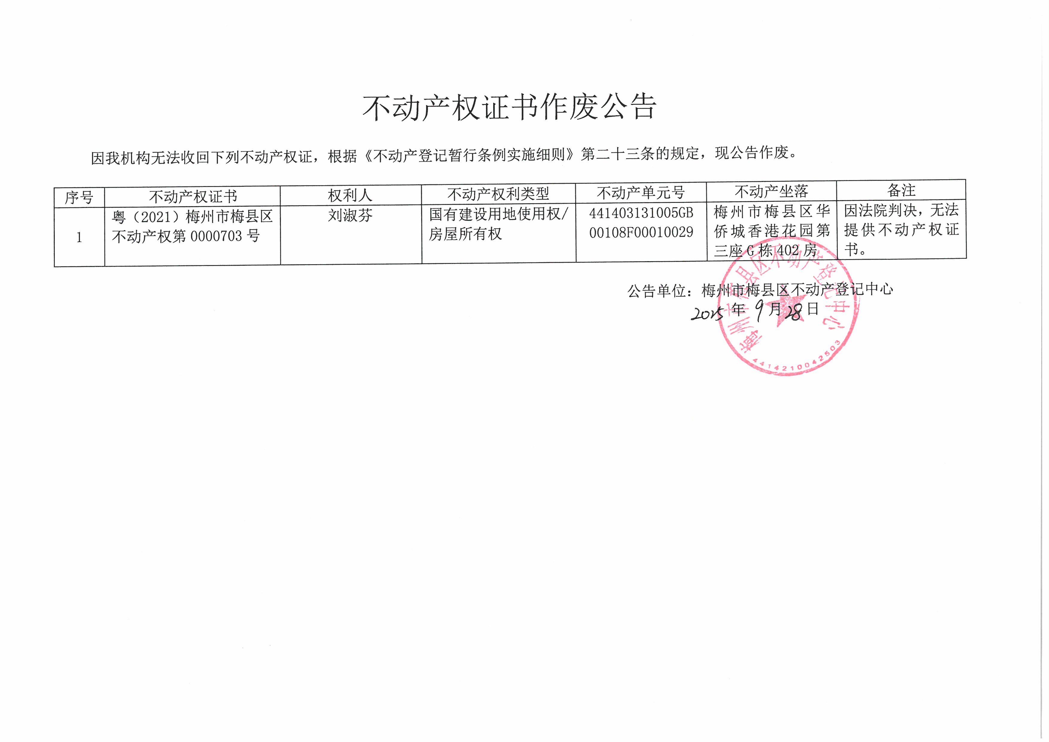 公告单位:梅州市梅县区不动产登记中心