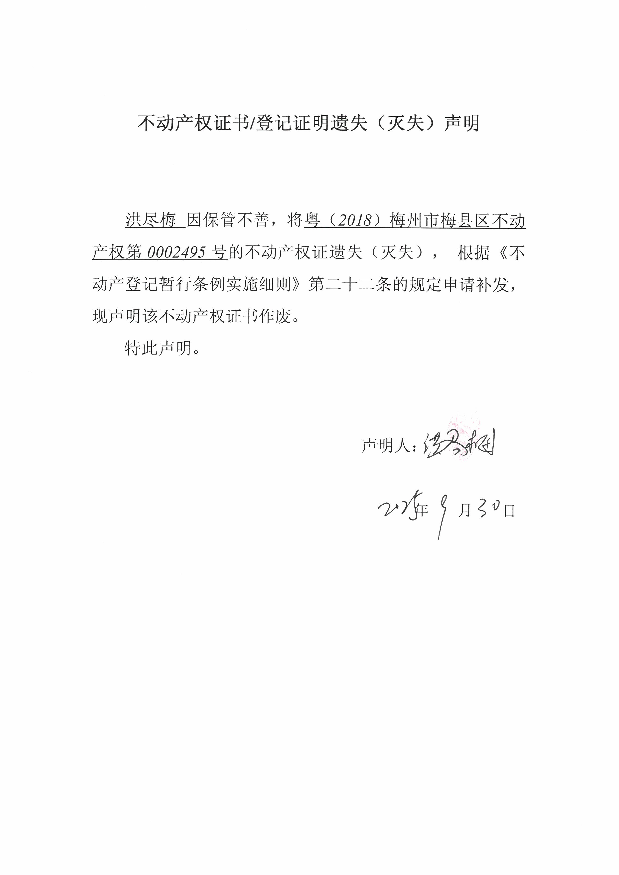 洪尽梅因保管不善,将粤(2018)梅州市梅县区不动产权第0002495号的不动产权证遗失(灭失),根据《不动产登记暂行条例实施细则》第二十二条的规定申请补发,现声明该不动产权证书作废。