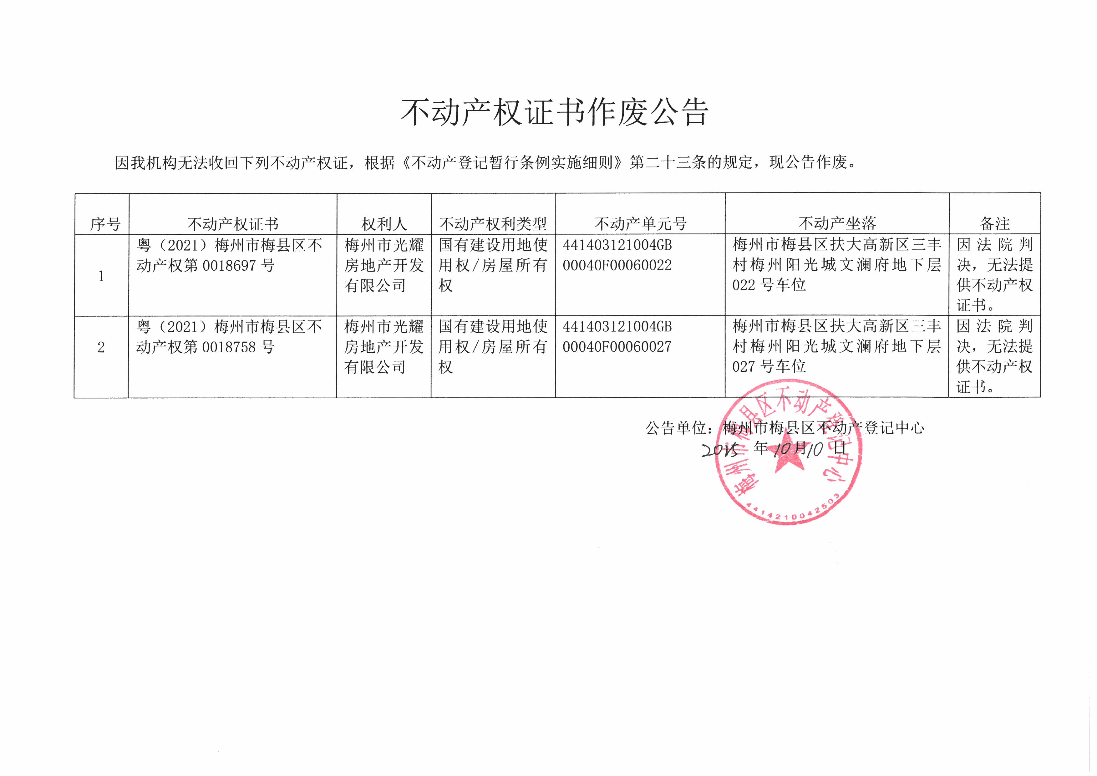 2 | 粤(2021)梅州市梅县区不动产权第0018758号 | 梅州市光耀房地产开发有限公司 | 国有建设用地使用权/房屋所有权 | 441403121004GB 00040F00060027 | 梅州市梅县区扶大高新区三丰村梅州阳光城文澜府地下层027号车位 | 因法院判决,无法提供不动产权证书。 |