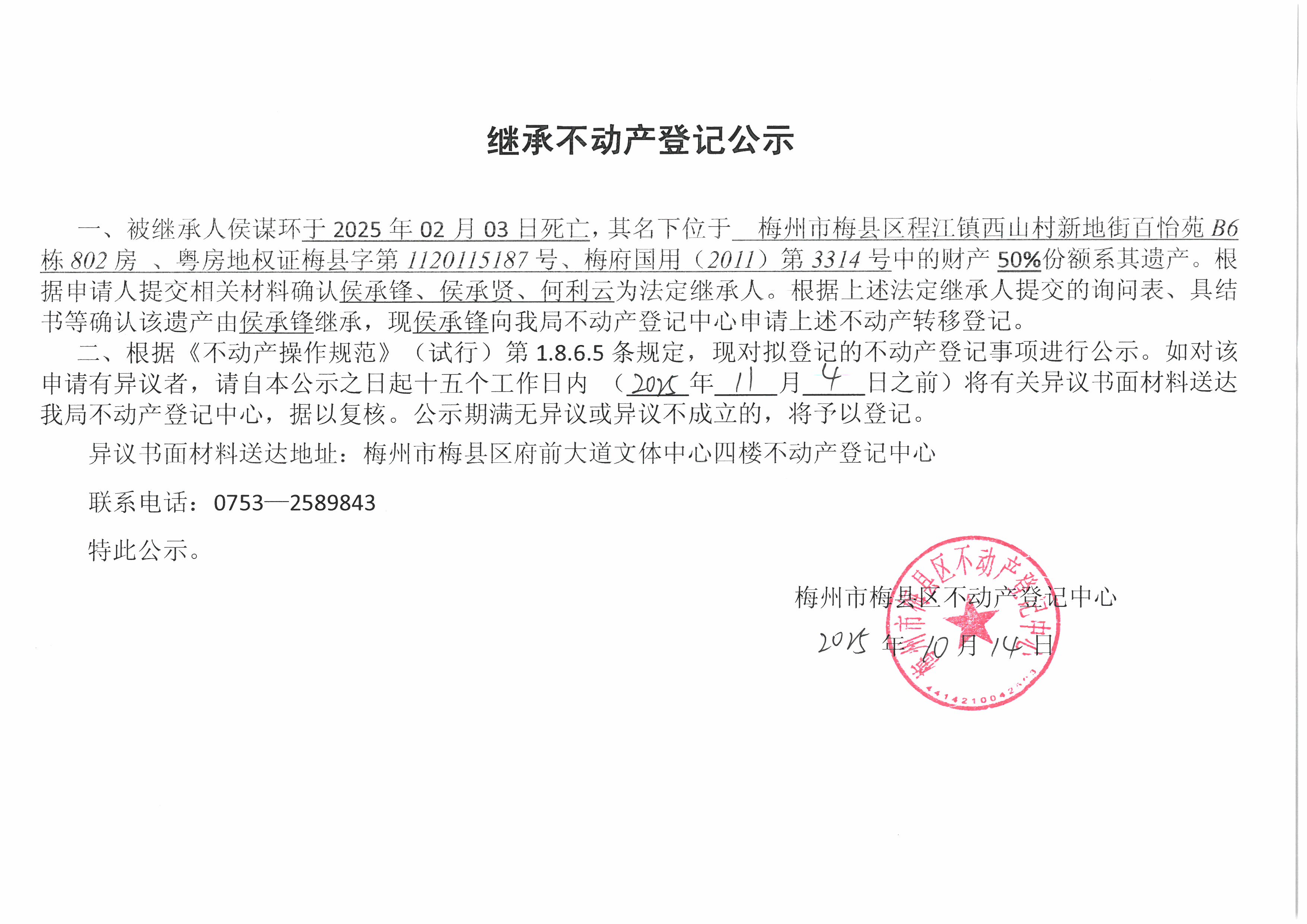 被继承人侯谋环于2025年02月03日死亡,其名下位于梅州市梅县区程江镇西山村新地街百怡苑B6栋802房、粤房地权证梅县字第1120115187号、梅府国用(2011)第3314号中的财产50%份额系其遗产。根据申请人提交相关材料确认侯承锋、侯承贤、何利云为法定继承人。根据上述法定继承人提交的询问表、具结书等确认该遗产由侯承锋继承,现侯承锋向我局不动产登记中心申请上述不动产转移登记。