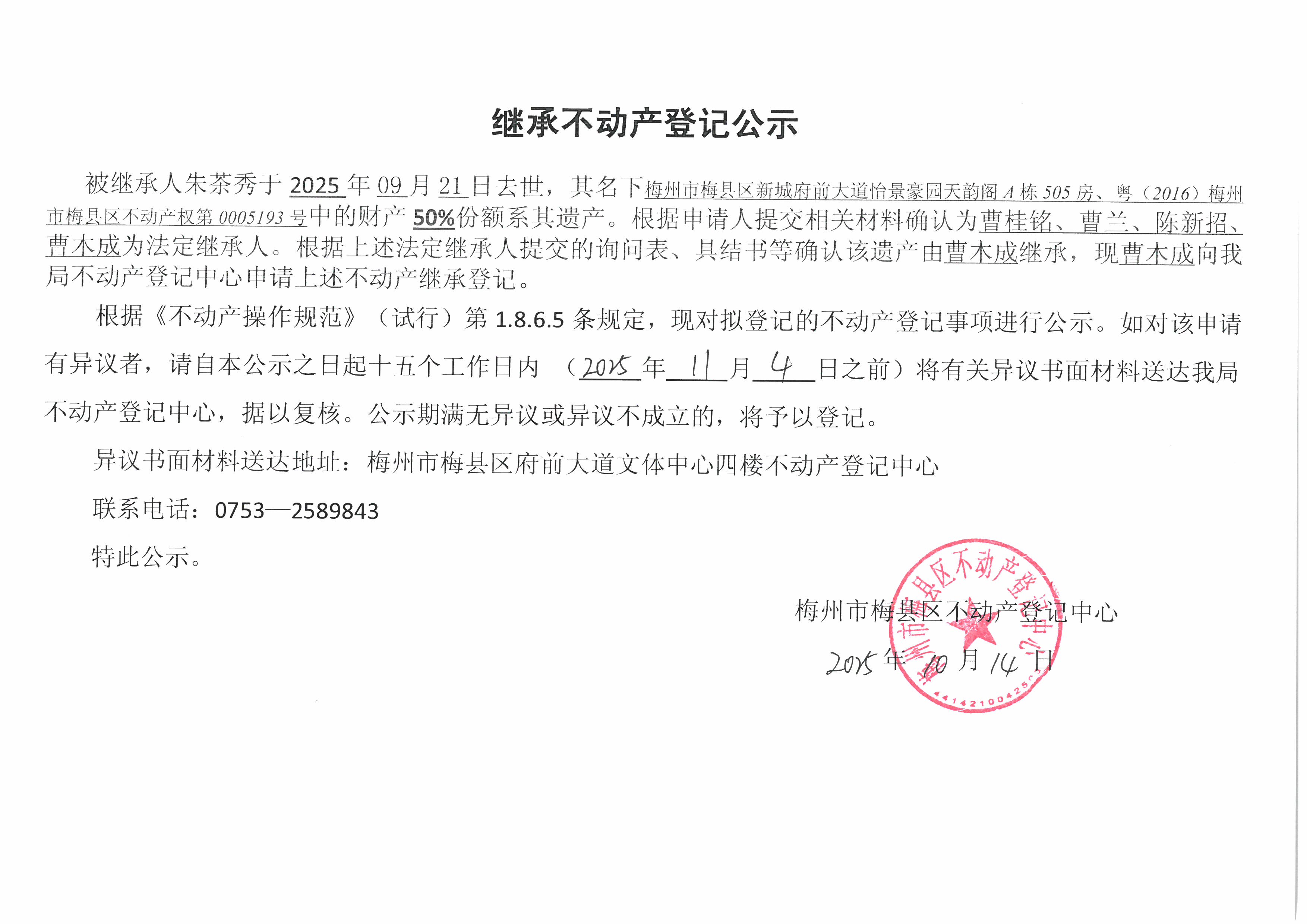被继承人朱茶秀于2025年09月21日去世,其名下梅州市梅县区新城府前大道怡景豪园天韵阁A栋505房、粤(2016)梅州市梅县区不动产权第0005193号中的财产50%份额系其遗产。根据申请人提交相关材料确认为曹桂铭、曹兰、陈新招、曹木成为法定继承人。根据上述法定继承人提交的询问表、具结书等确认该遗产由曹木成继承,现曹木成向我局不动产登记中心申请上述不动产继承登记。