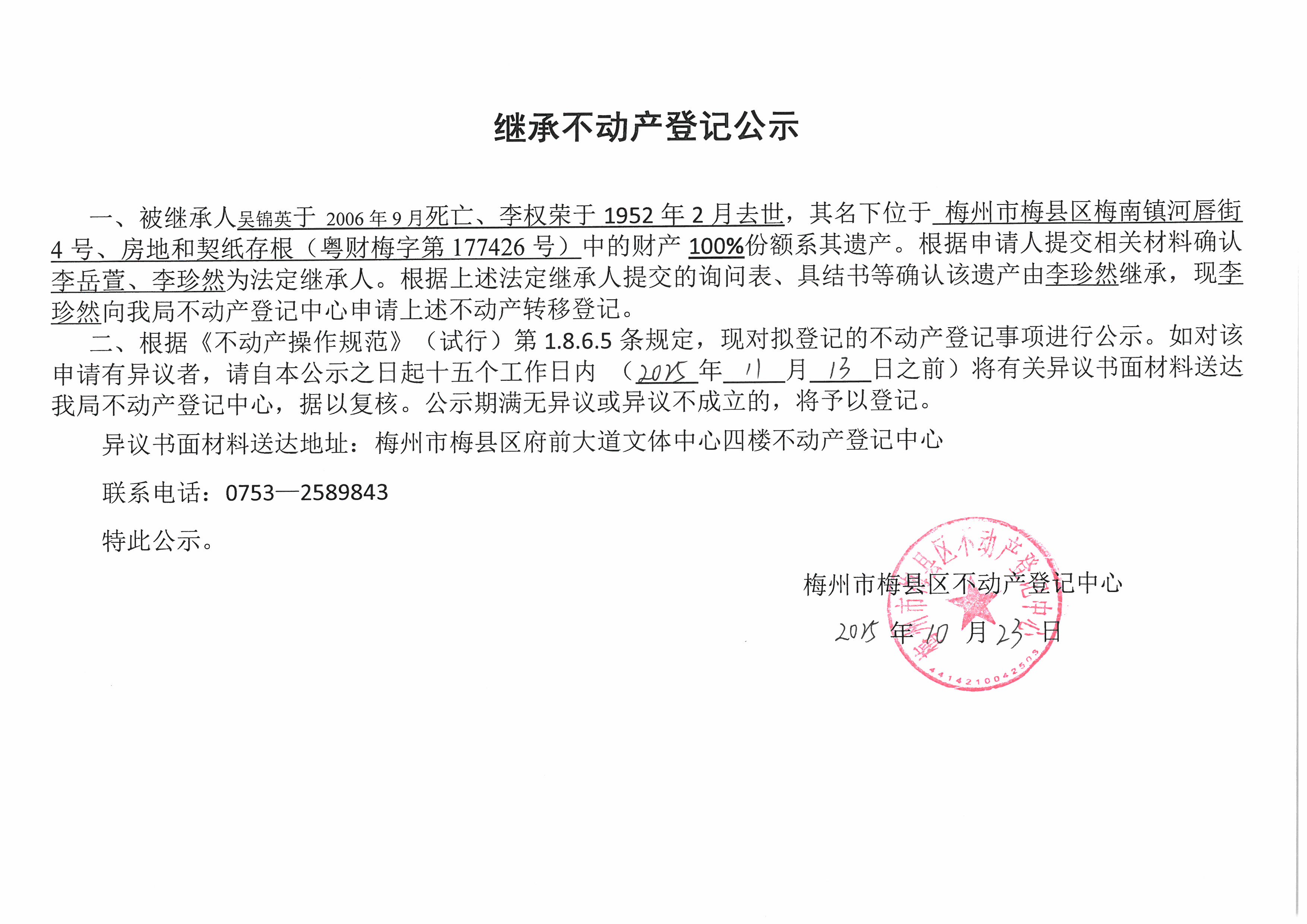 被继承人吴锦英于2006年9月死亡、李权荣于1952年2月去世,其名下位于梅州市梅县区梅南镇河唇街4号、房地和契纸存根(粤财梅字第177426号)中的财产100%份额系其遗产。根据申请人提交相关材料确认李岳萱、李珍然为法定继承人。根据上述法定继承人提交的询问表、具结书等确认该遗产由李珍然继承,现李珍然向我局不动产登记中心申请上述不动产转移登记。。