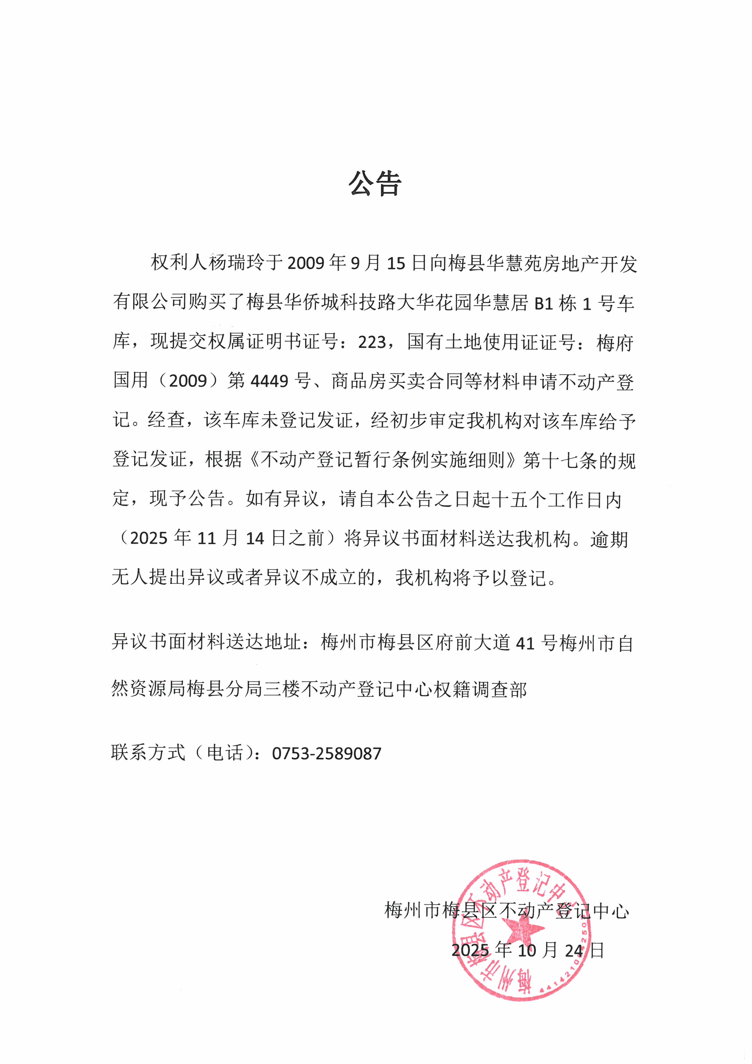 权利人杨瑞玲于2009年9月15日向梅县华慧苑房地产开发有限公司购买了梅县华侨城科技路大华花园华慧居B1栋1号车库,现提交权属证明书证号:223,国有土地使用证证号:梅府国用(2009)第4449号、商品房买卖合同等材料申请不动产登记。经查,该车库未登记发证,经初步审定我机构对该车库给予登记发证,根据《不动产登记暂行条例实施细则》第十七条的规定,现予公告。如有异议,请自本公告之日起十五个工作日内(2025年11月14日之前)将异议书面材料送达我机构。逾期无人提出异议或者异议不成立的,我机构将予以登记。