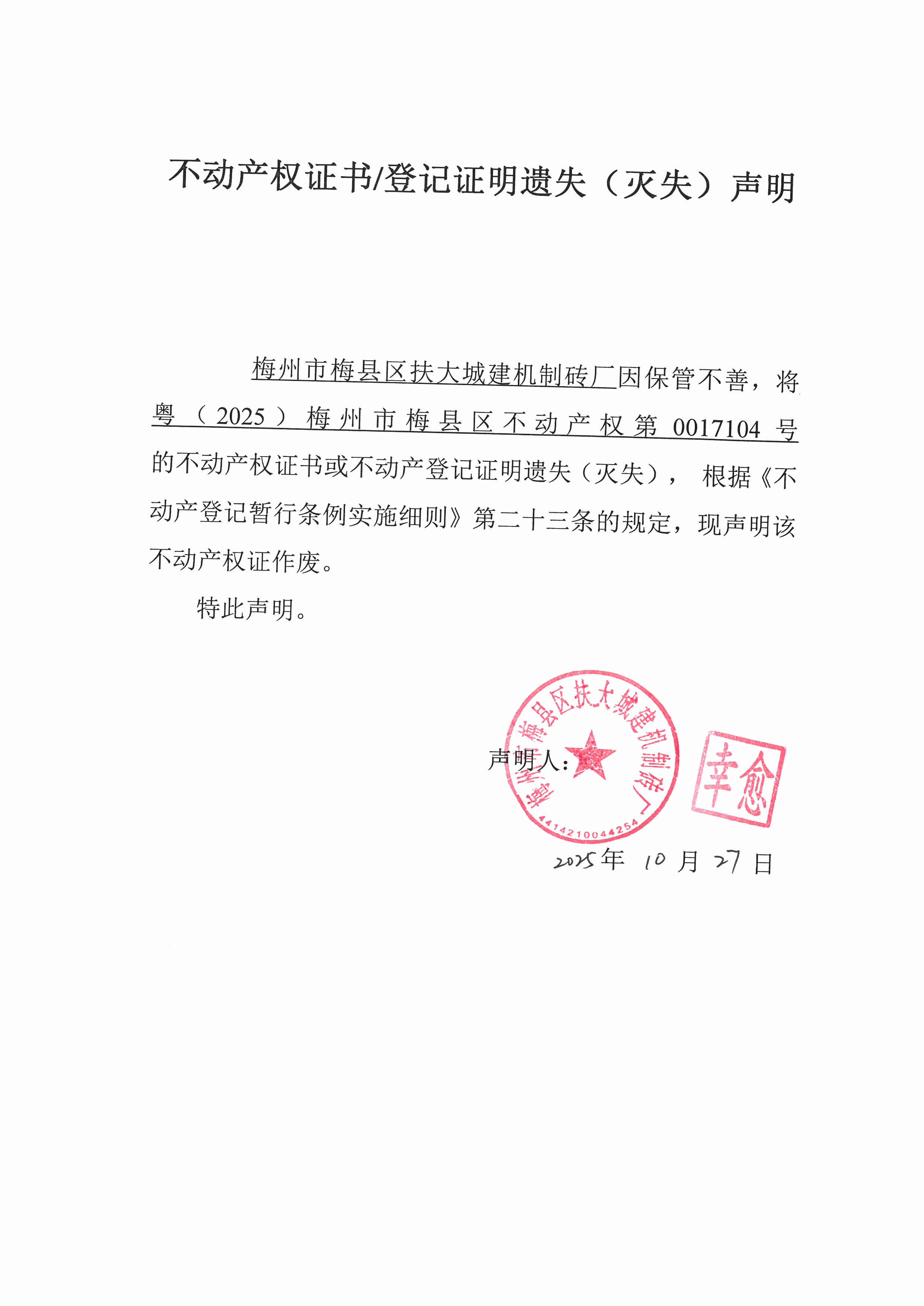 梅州市梅县区扶大城建机制砖厂因保管不善,将粤(2025)梅州市梅县区不动产权第0017104号的不动产权证书或不动产登记证明遗失(灭失),根据《不动产登记暂行条例实施细则》第二十三条的规定,现声明该不动产权证作废。