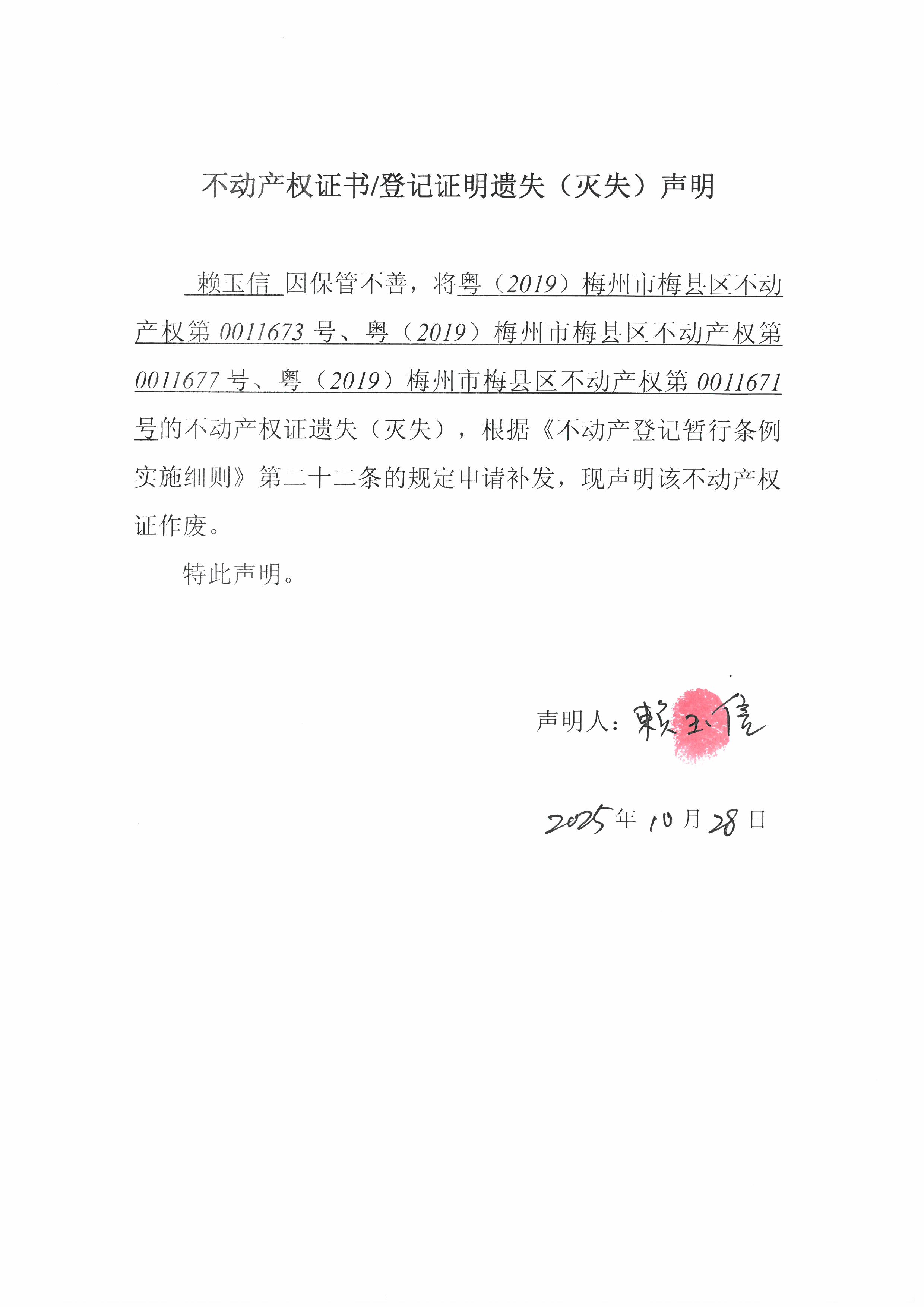 赖玉信因保管不善,将粤(2019)梅州市梅县区不动产权第0011673号、粤(2019)梅州市梅县区不动产权第0011677号、粤(2019)梅州市梅县区不动产权第0011671号的不动产权证遗失(灭失),根据《不动产登记暂行条例实施细则》第二十二条的规定申请补发,现声明该不动产权证作废。