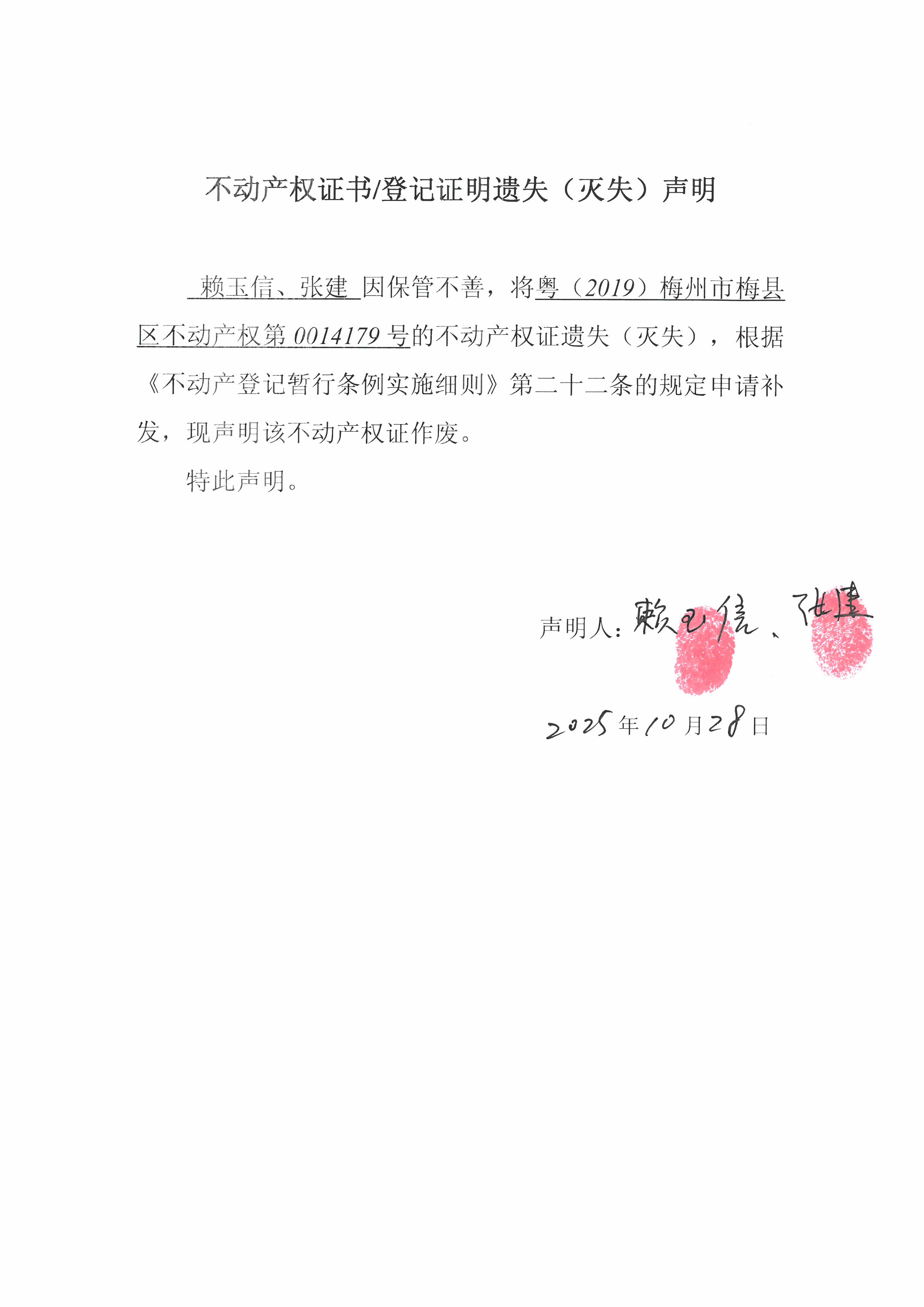 赖玉信、张建因保管不善,将粤(2019)梅州市梅县区不动产权第0014179号的不动产权证遗失(灭失),根据《不动产登记暂行条例实施细则》第二十二条的规定申请补发,现声明该不动产权证作废。