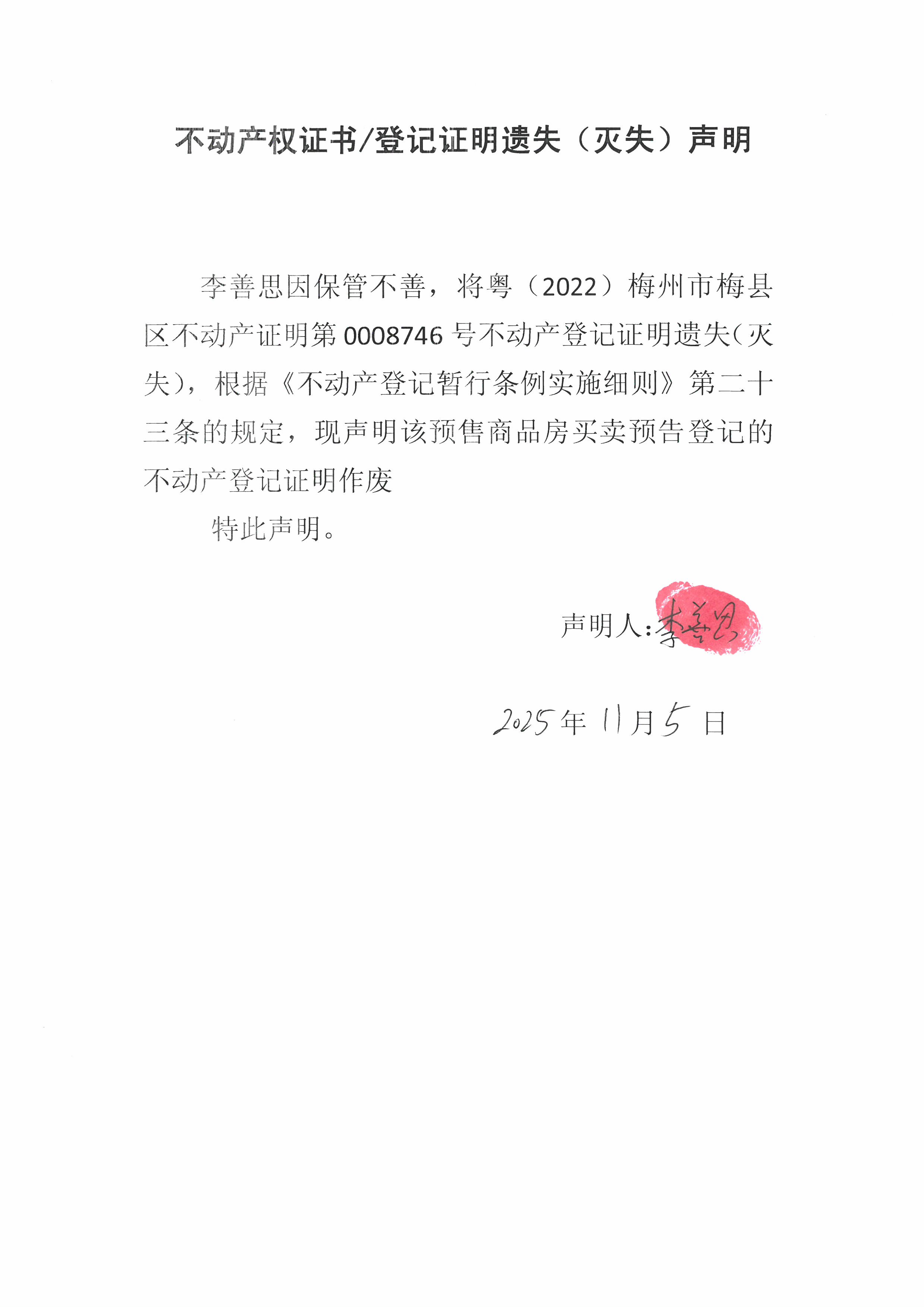 李善思因保管不善,将粤(2022)梅州市梅县区不动产证明第0008746号不动产登记证明遗失(灭失),根据《不动产登记暂行条例实施细则》第二十三条的规定,现声明该预售商品房买卖预告登记的不动产登记证明作废。