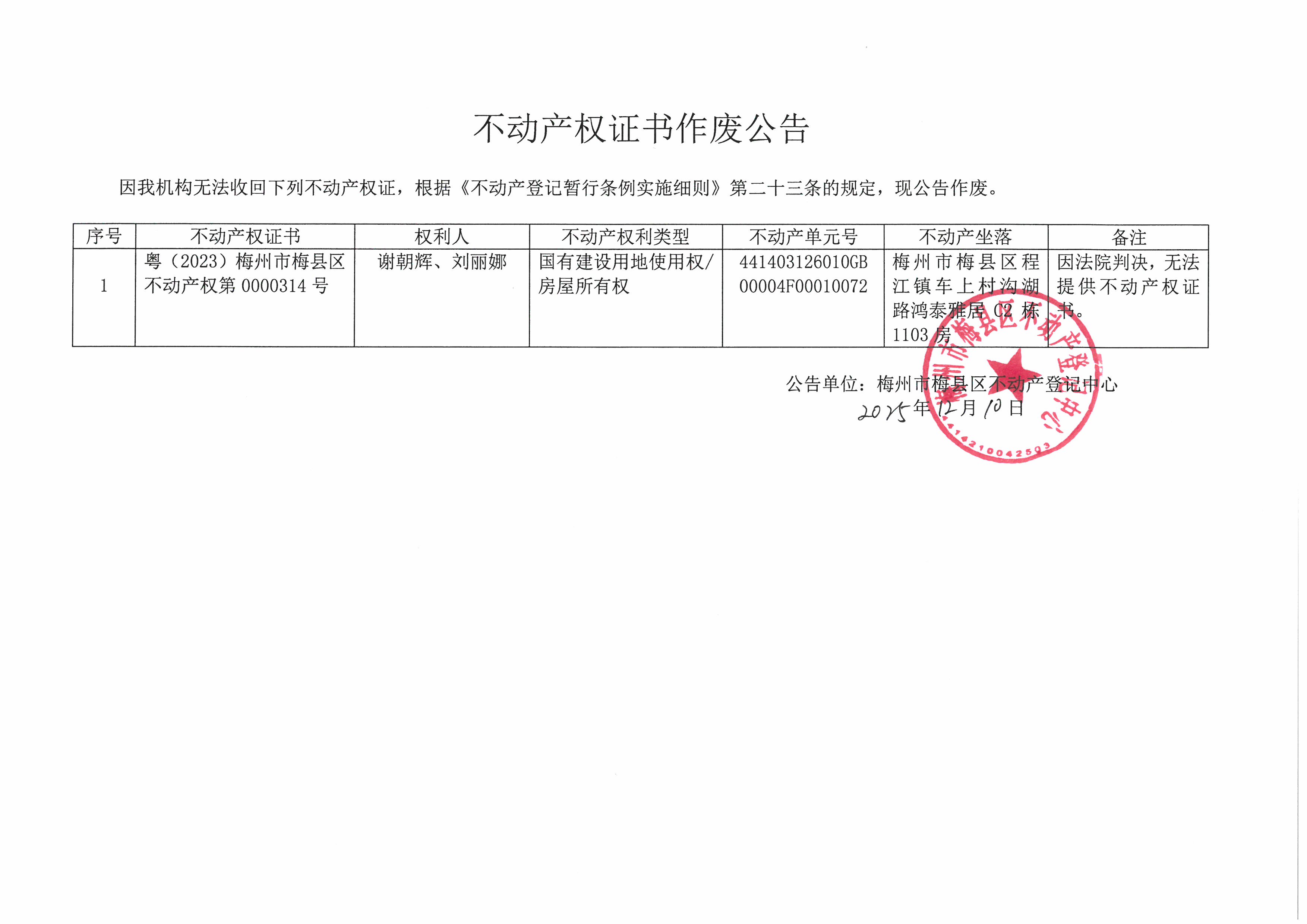 因我机构无法收回下列不动产权证,根据《不动产登记暂行条例实施细则》第二十三条的规定,现公告作废。