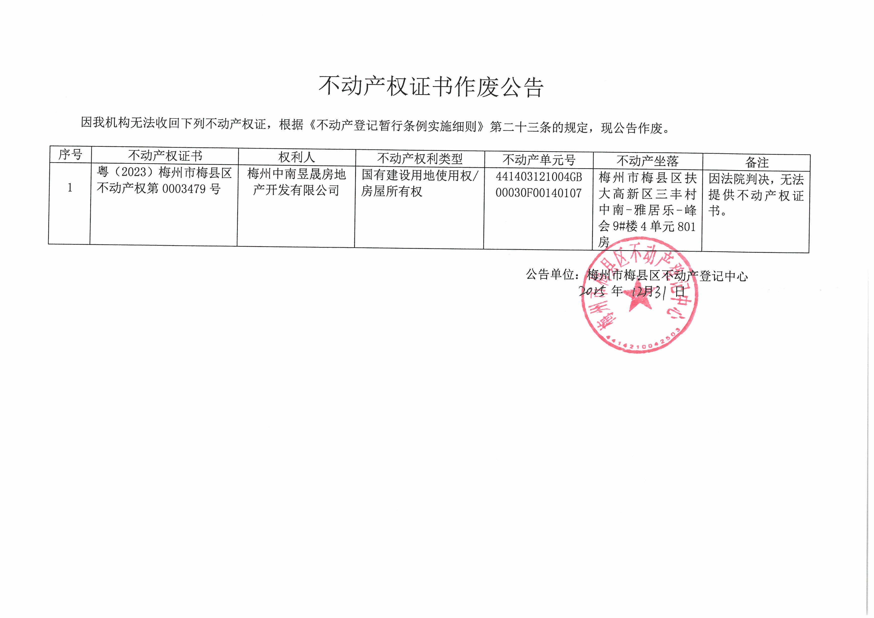 1 | 粤(2023)梅州市梅县区不动产权第0003479号 | 梅州中南昱晟房地产开发有限公司 | 国有建设用地使用权/房屋所有权 | 441403121004GB 00030F00140107 | 梅州市梅县区扶大高新区三丰村中南-雅居乐-峰会9#楼4单元801房 | 因法院判决,无法提供不动产权证书。 |