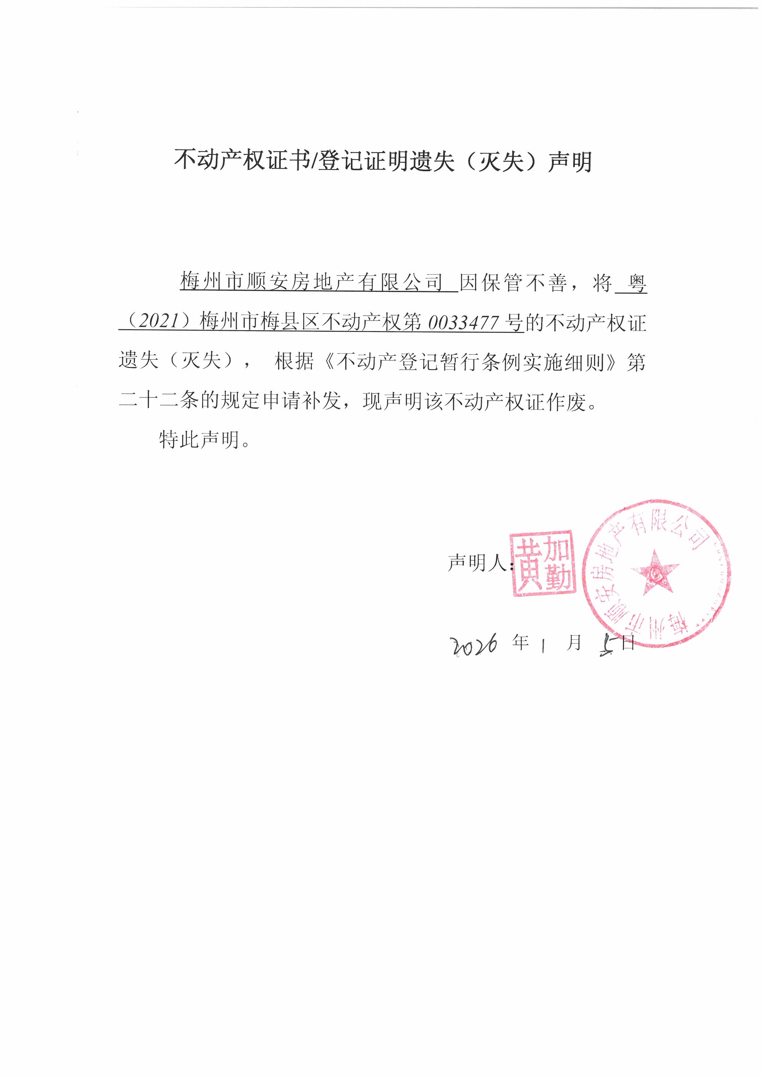 梅州市顺安房地产有限公司因保管不善,将粤(2021)梅州市梅县区不动产权第0033477号的不动产权证遗失(灭失),根据《不动产登记暂行条例实施细则》第二十二条的规定申请补发,现声明该不动产权证作废。