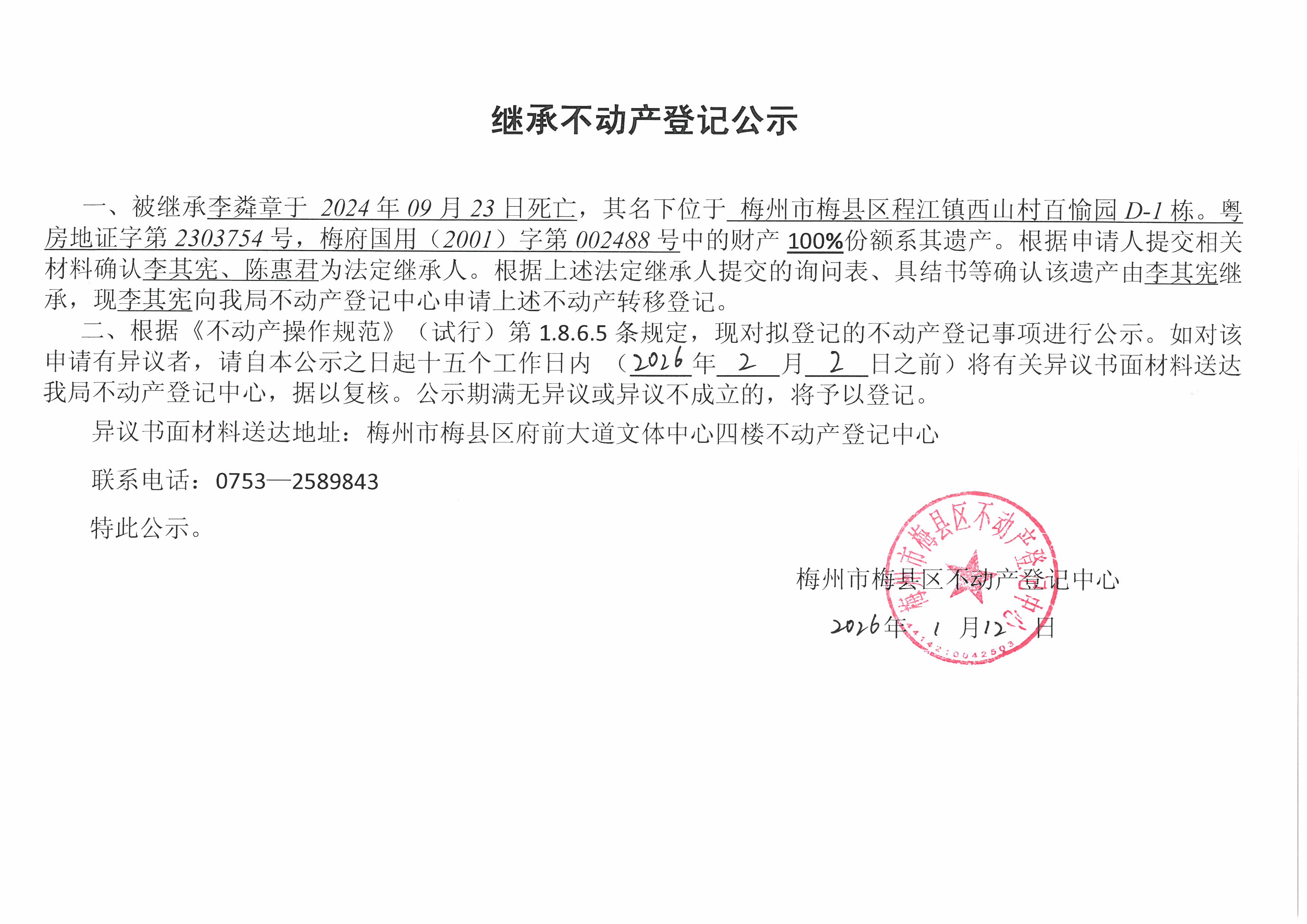 被继承李粦章于 2024年09月23日死亡,其名下位于 梅州市梅县区程江镇西山村百愉园D-1栋。粤房地证字第2303754号,梅府国用(2001)字第002488号中的财产100%份额系其遗产。根据申请人提交相关材料确认李其宪、陈惠君为法定继承人。根据上述法定继承人提交的询问表、具结书等确认该遗产由李其宪继承,现李其宪向我局不动产登记中心申请上述不动产转移登记。