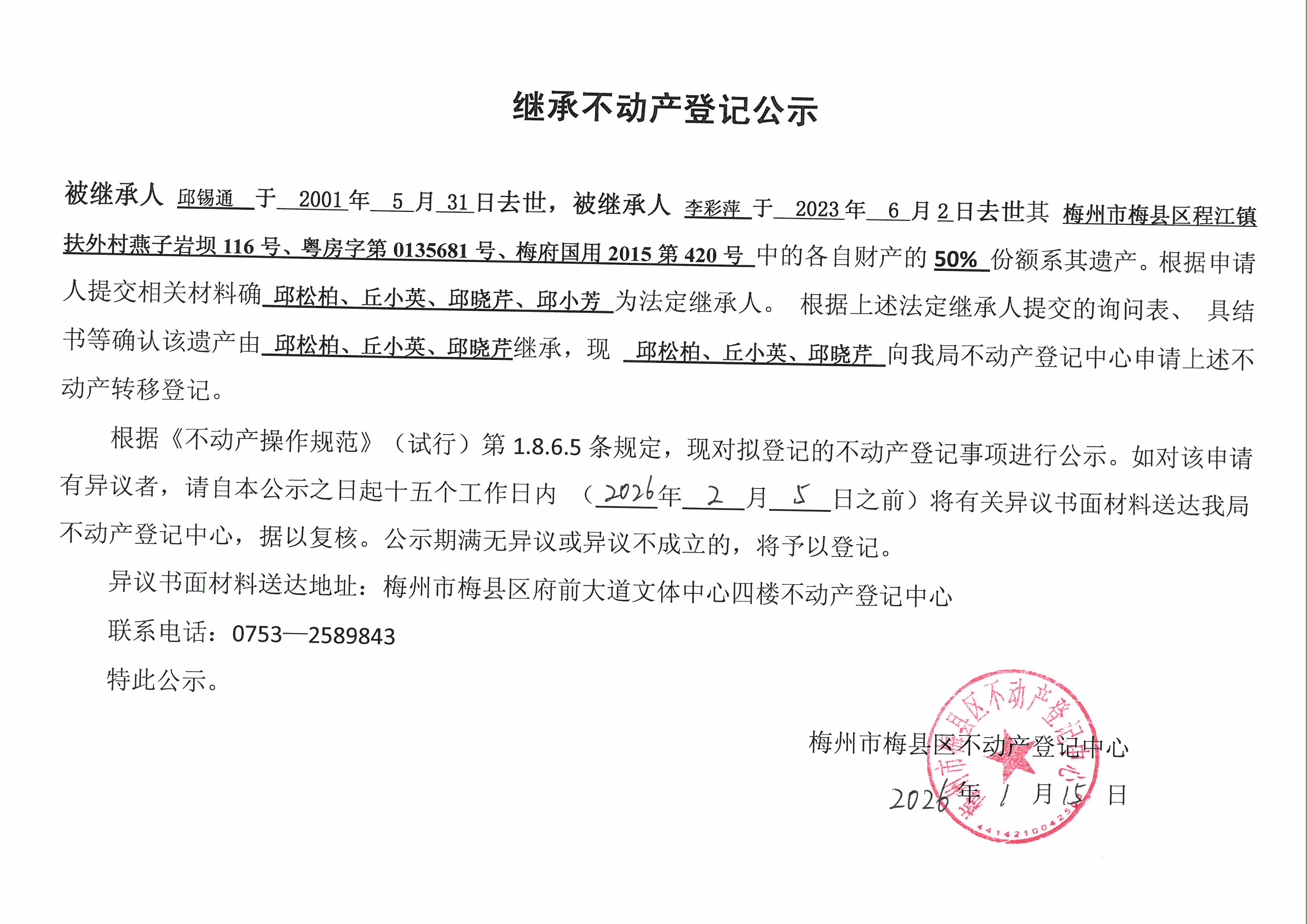 被继承人邱锡通于2001年5月31日去世,被继承人李彩萍于2023年6月2日去世其梅州市梅县区程江镇扶外村燕子岩坝116号、粤房字第0135681号、梅府国用2015第420号中的各自财产的50%份额系其遗产。根据申请人提交相关材料确邱松柏、丘小英、邱晓芹、邱小芳为法定继承人。根据上述法定继承人提交的询问表、具结书等确认该遗产由邱松柏、丘小英、邱晓芹继承,现邱松柏、丘小英、邱晓芹向我局不动产登记中心申请上述不动产转移登记。